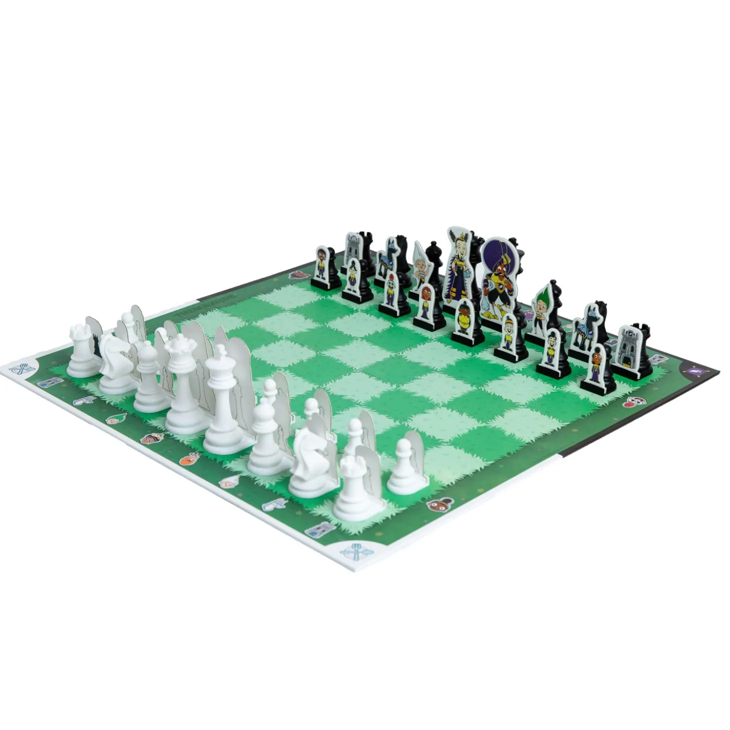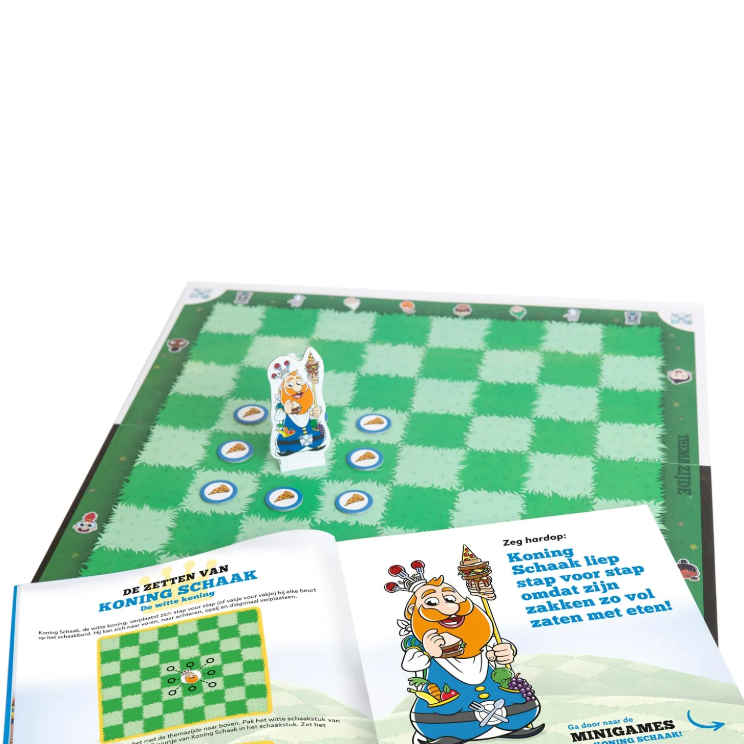 Inhoud: 32 aangepaste schaakstukken, 32 personages; 1 verhalenboek met schaakinstructies, 30 minigame-fiches, 2-in-1 schaakbord, 2 opbergzakken voor schaakstukken en spelregels.