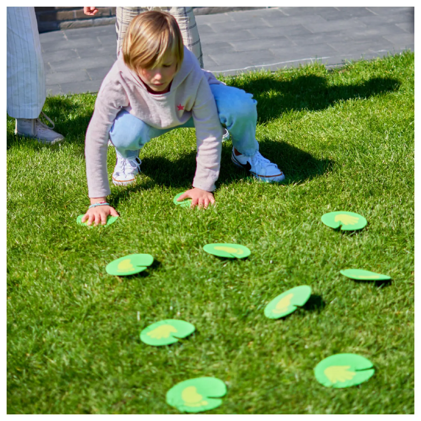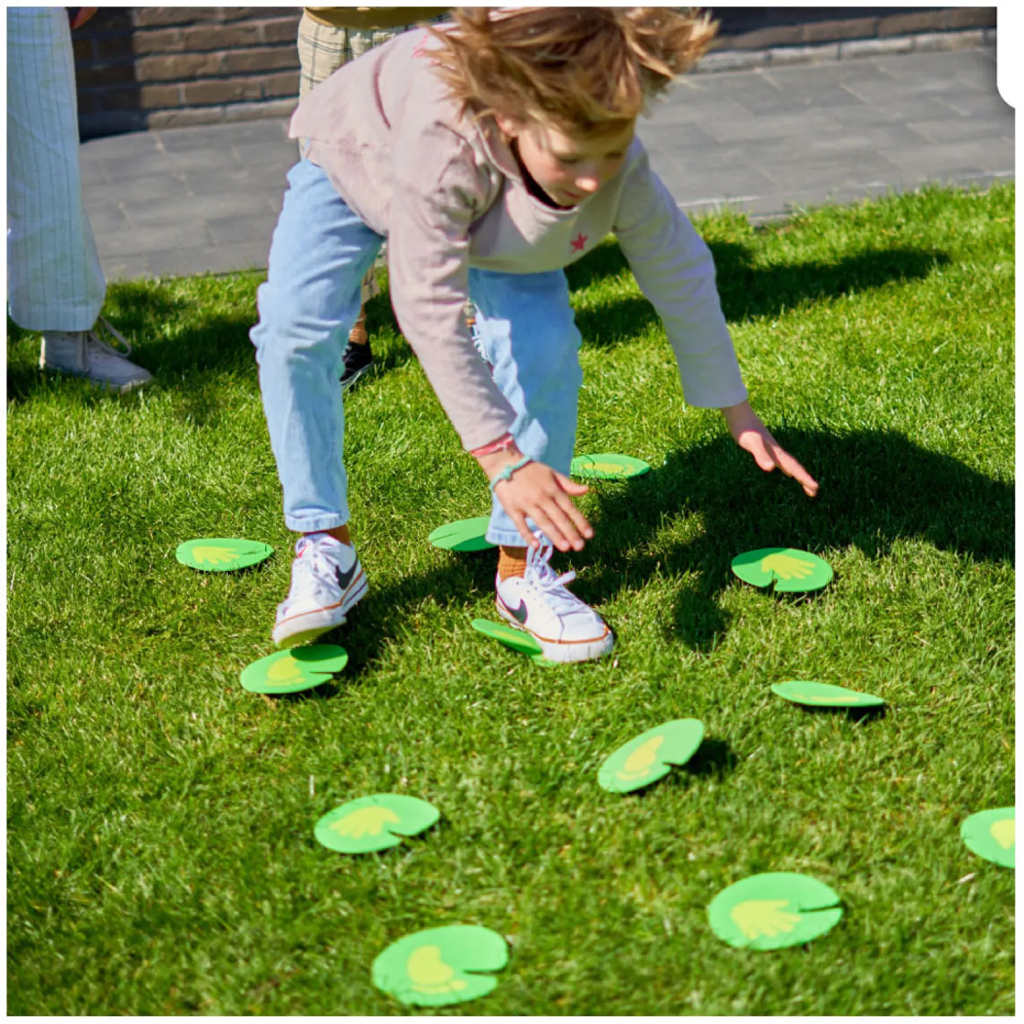 Maak een parcours van leliebladen. Op de leliebladen staan handen en voeten afgebeeld.