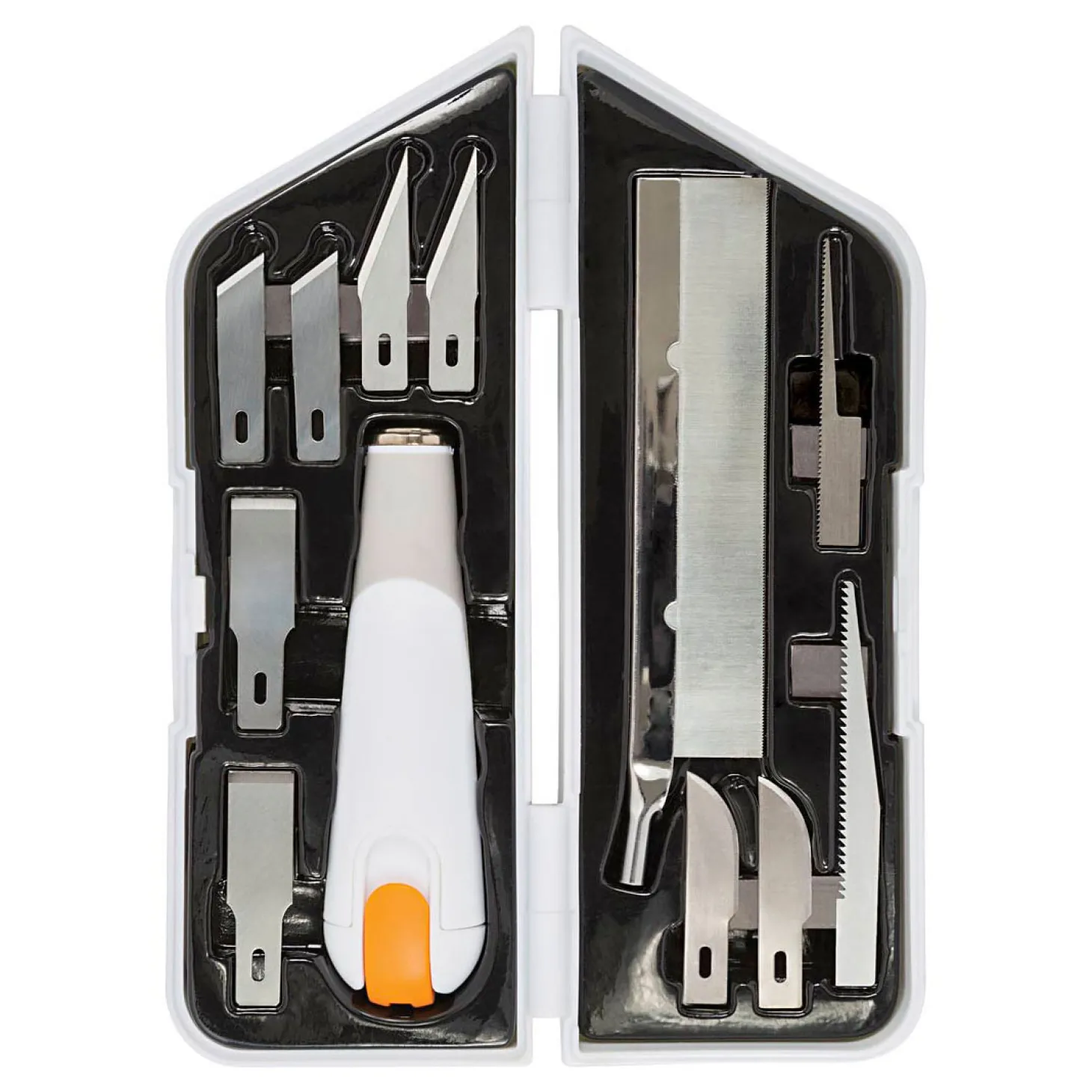 Mes met uitstekende prestatie met 11 uitwisselbare mesbladen, geleverd in een handige opbergdoos. Allround mes, beitel en zaagset met diverse uitwisselbare messen speciaal voor linoleum, hout, acryl of andere zware taken