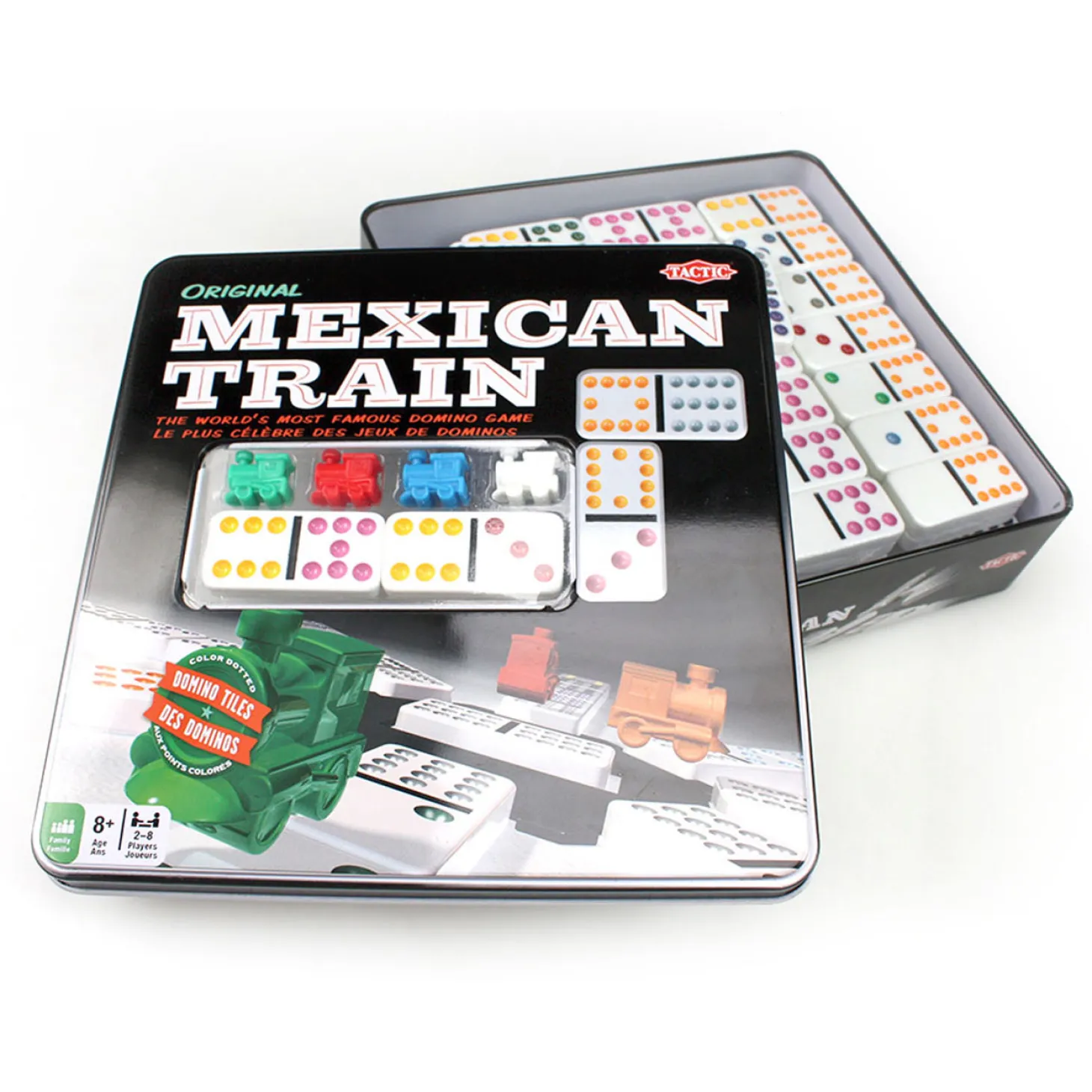 Elke speler probeert vanuit het midden een rij van dominostenen aan te leggen. Je mag ook aanleggen aan de gezamenlijke rij, dat is de Mexican Train. Het spel heeft dominostenen van hoge kwaliteit en leuke treinpionnen. Het populairste dominospel ter wereld! De set bestaat uit 91 gekleurde dubbele dominostenen, treinstation middenstuk, 8 markeertreintjes, spelregels en komt in een mooie tinnen doos.