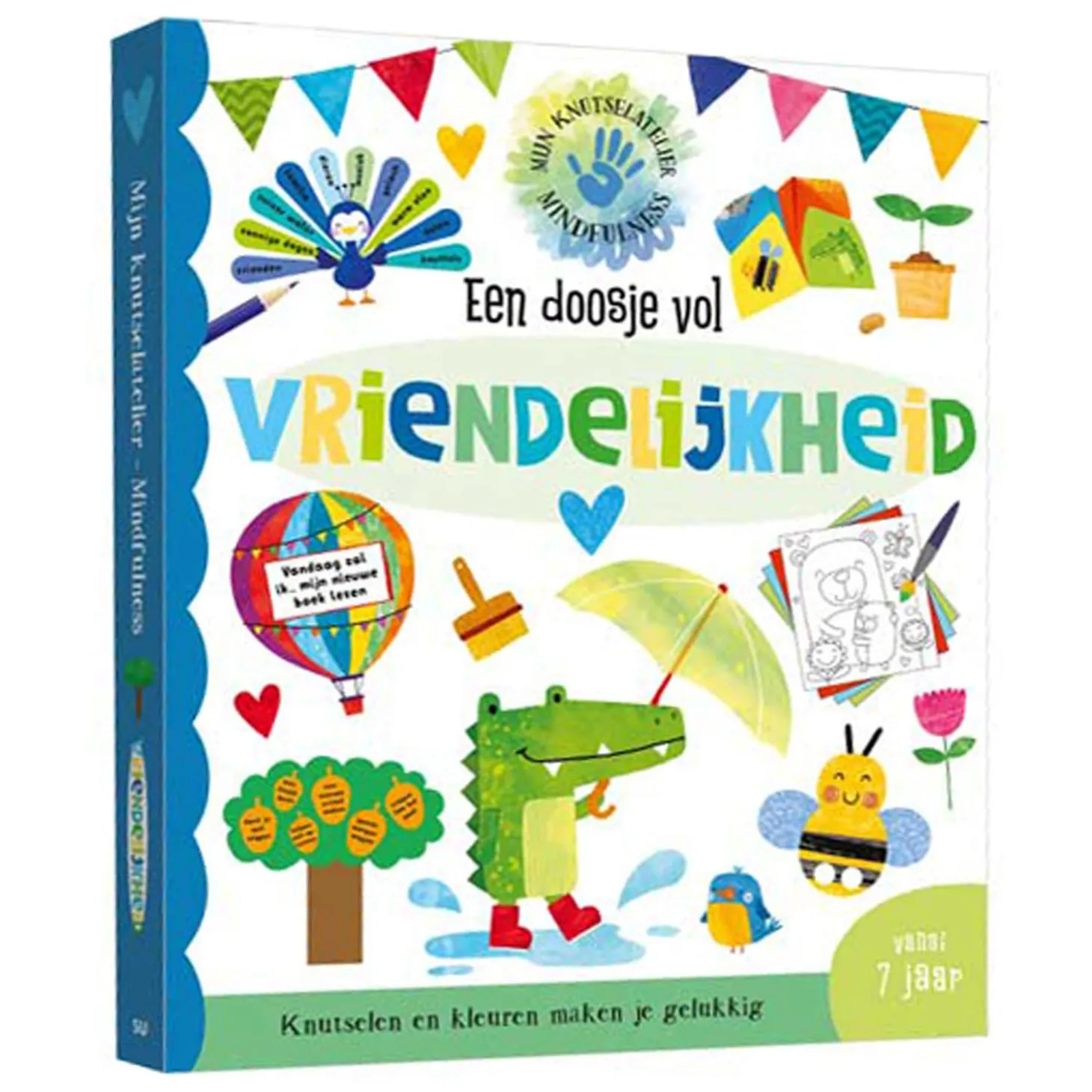 Dit doosje bevat kleurbladen, gekleurd papier, stukken vilt, stickers, voorbeelden, borduurgaren en sjablonen, waarmee je wenskaarten en doosjes, vingerpoppetjes, een vriendschapsarmband en nog veel meer kunt maken.