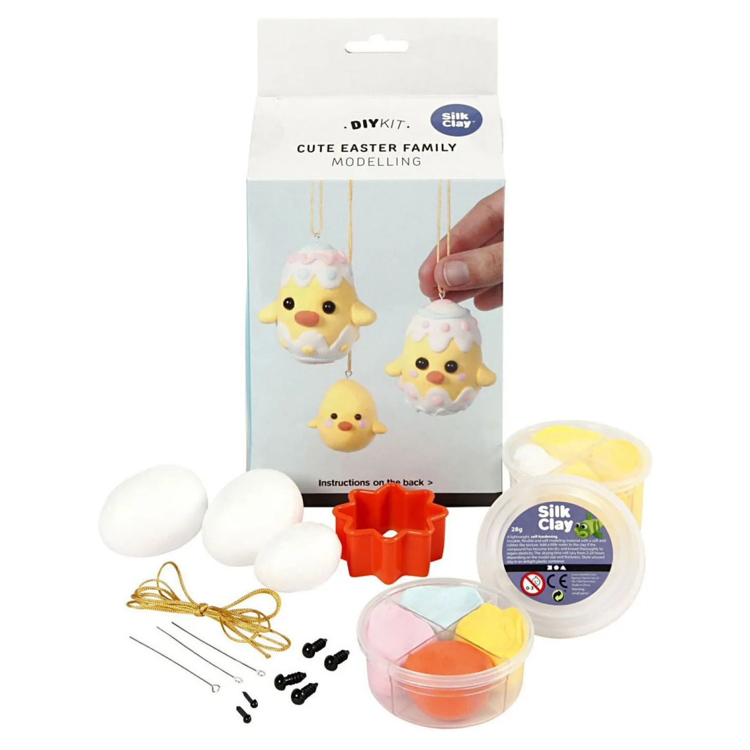 Materialenset voor 3 kippen van Silk Clay en styropor. Inclusief ophangkoord.Inhoud: 6 kleuren Silk Clay, 3 eieren, 1 uitsteekvorm, 3 paar plastic ogen, 3 nietstiften en koord