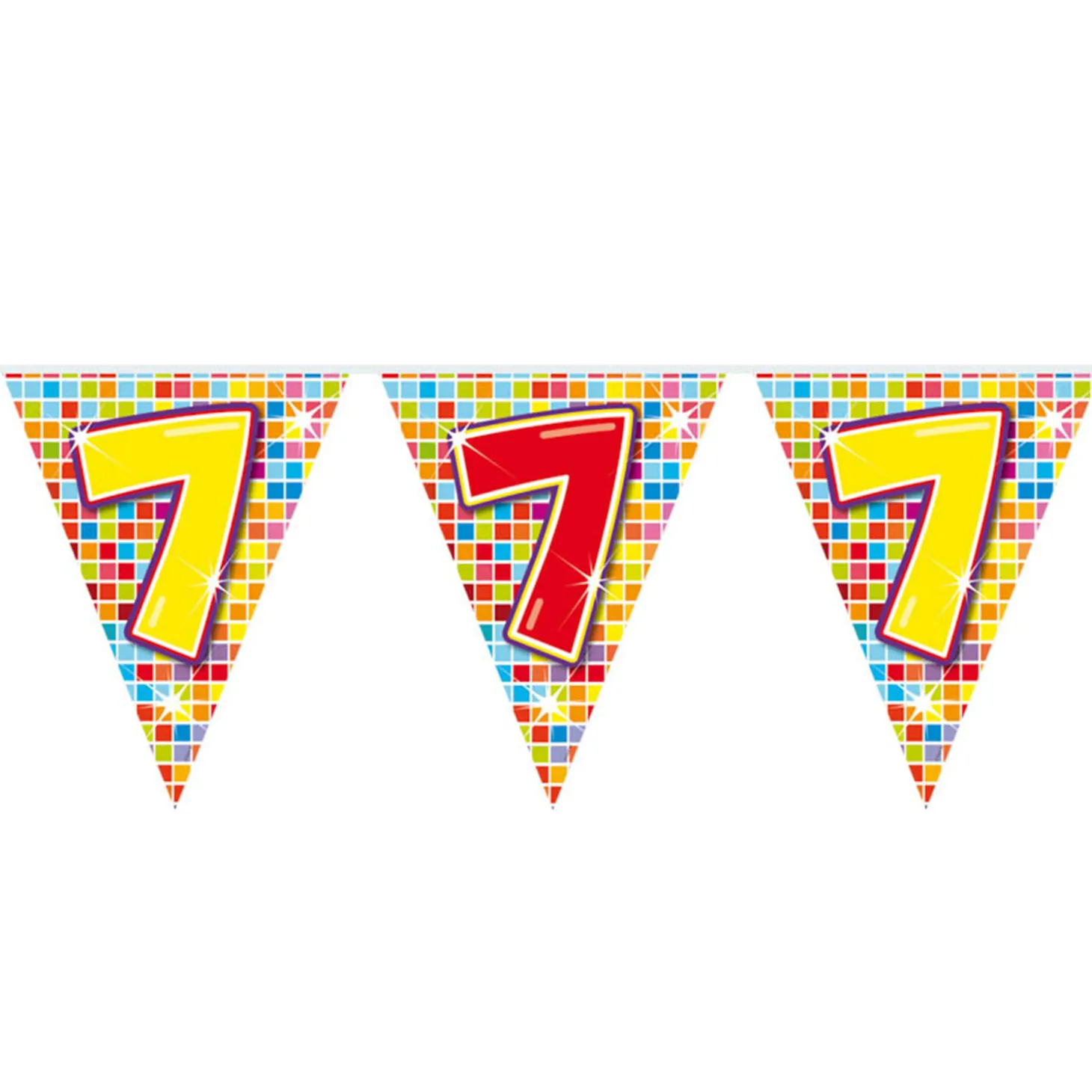 Wordt er iemand 7 jaar? Of vieren jullie een 7-jarig jubileum? Deze kleurrijke slinger staat perfect op ieder soort feestje! De slinger is enkelzijdig bedrukt, heeft 12 vlaggetjes en is 3 meter lang.