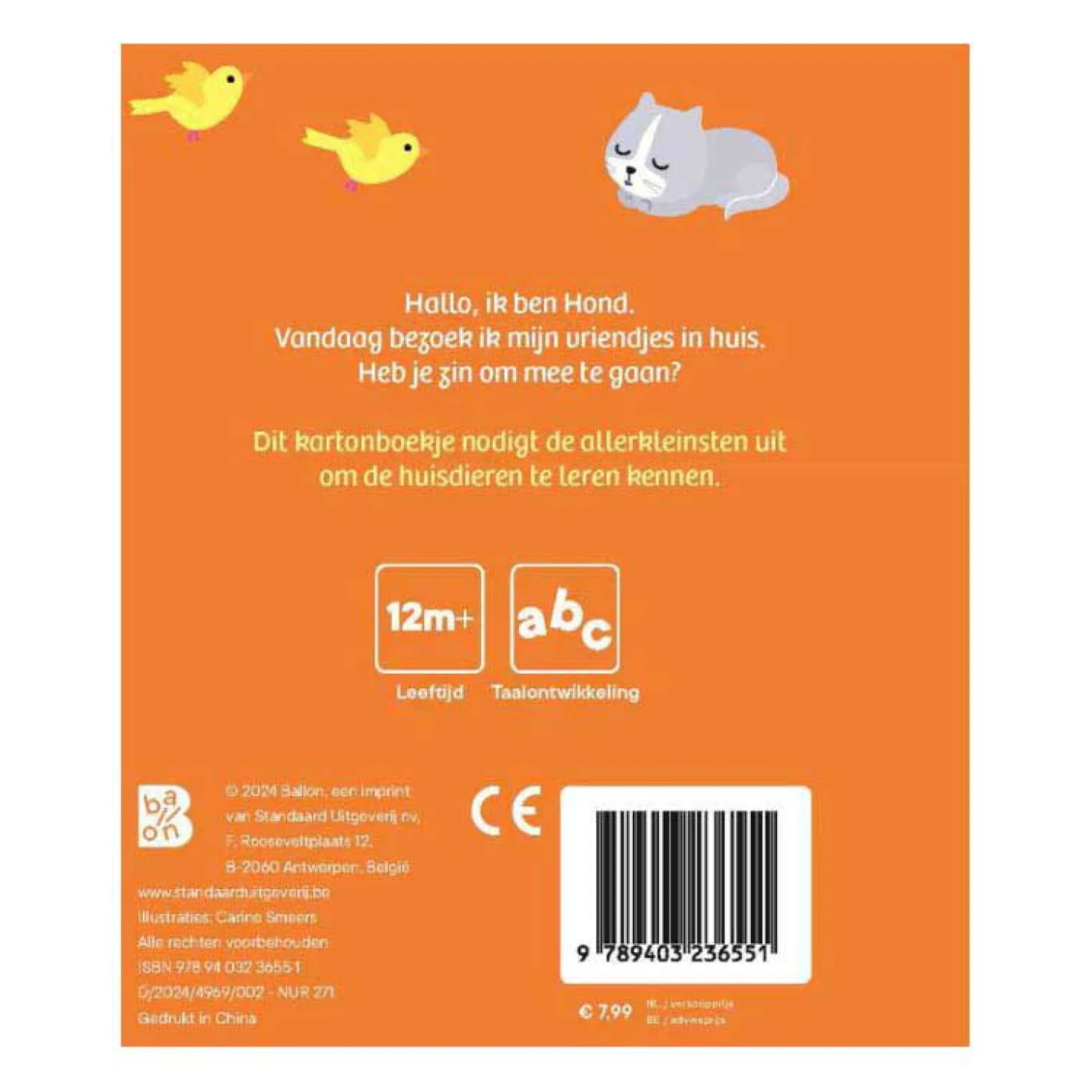 Hallo, ik ben Hond. Vandaag bezoek ik mijn vriendjes in huis. Heb je zin om mee te gaan? Dit kartonboekje nodigt de allerkleinsten uit om de huisdieren te leren kennen.