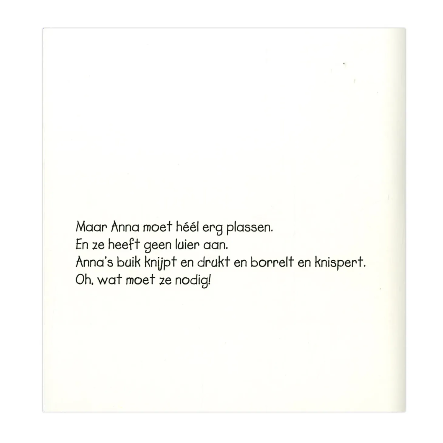Anna moet dringend plassen. Maar ze wil niet op het potje. Waar gaat Anna dan heen? Sssst ‘ niet meteen aan mama vertellen. Anna gaat op de grote wc.