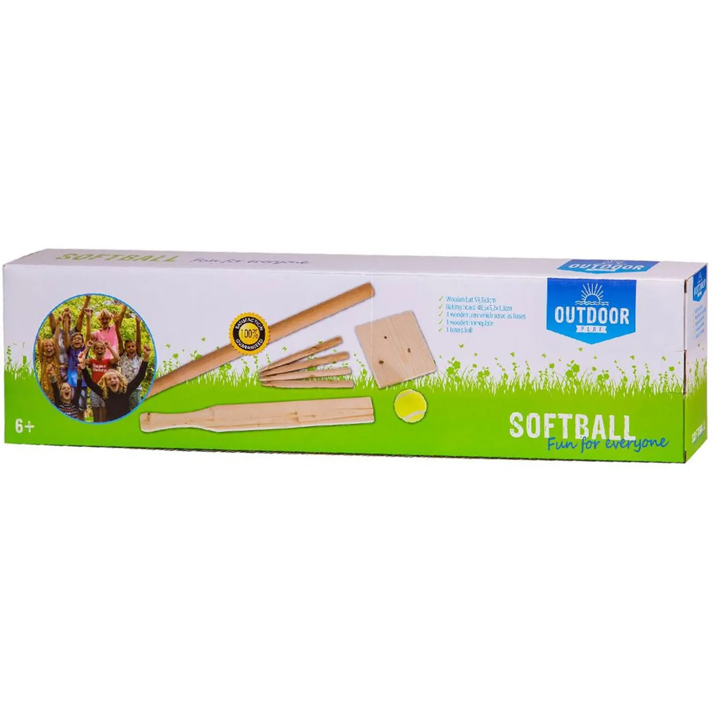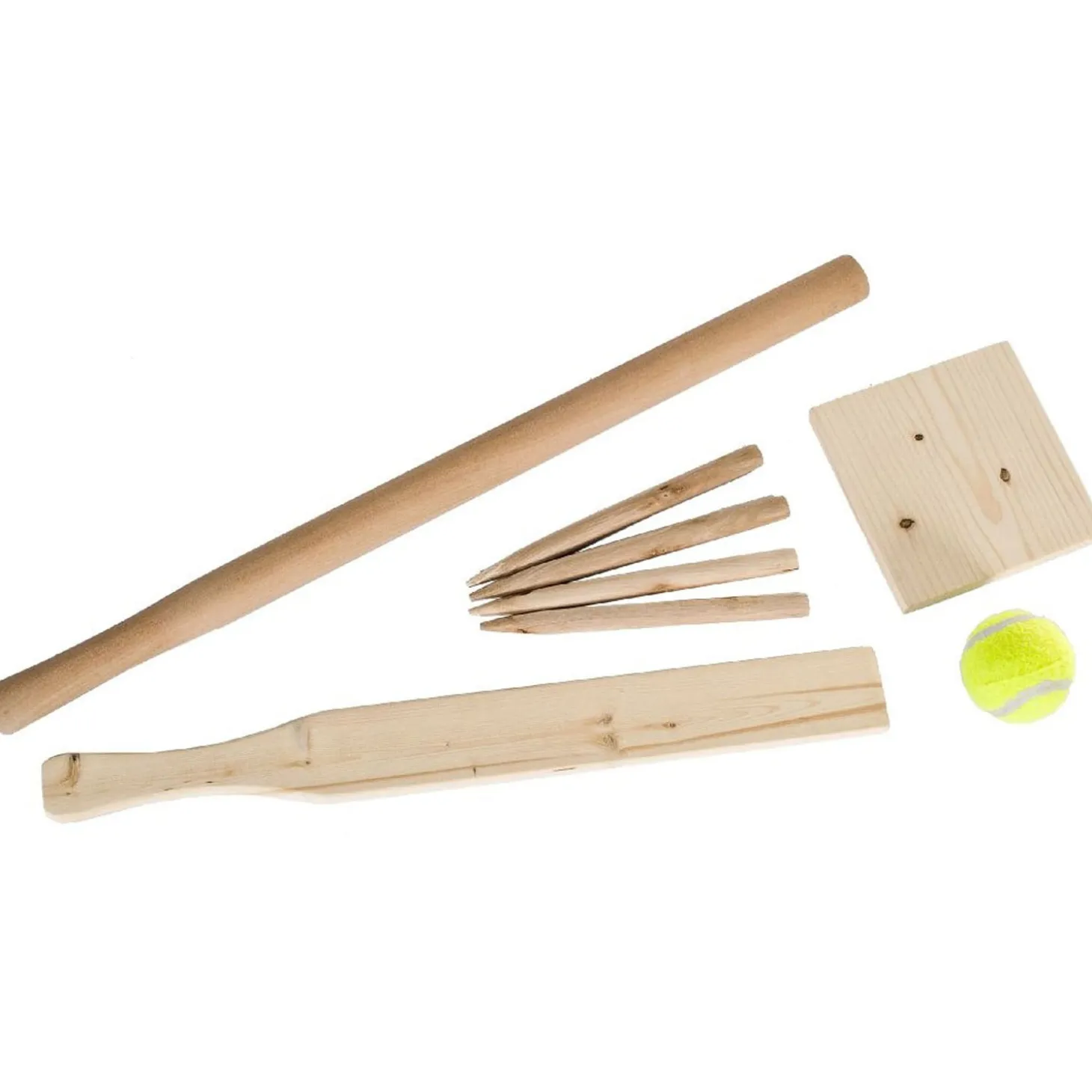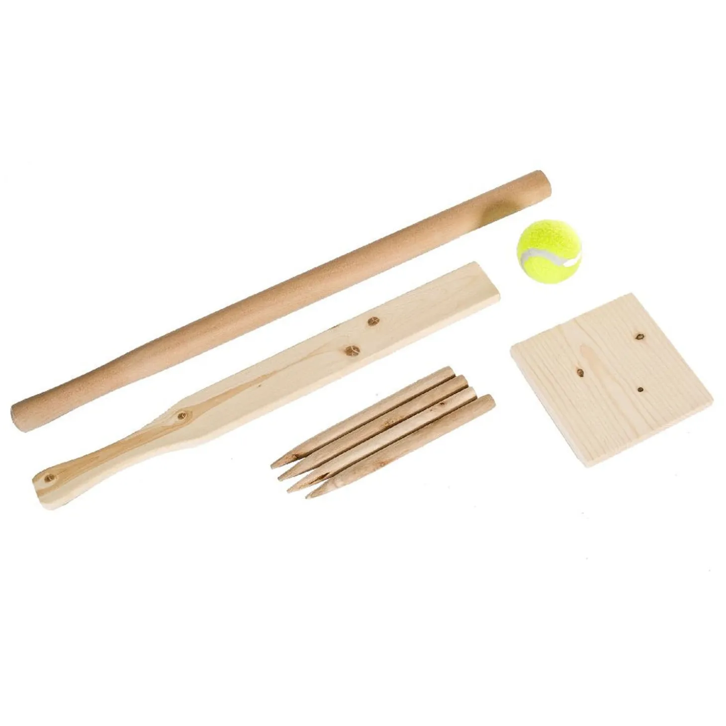 Deze set bestaat uit een houten knuppel (59,5 x 3 cm), een houten slagbal plankje (48,5 x 5,2 x 1,3 cm), 4 houten pennen die als honken dienen, 1 houten thuisplaat en een 1 tennisbal.