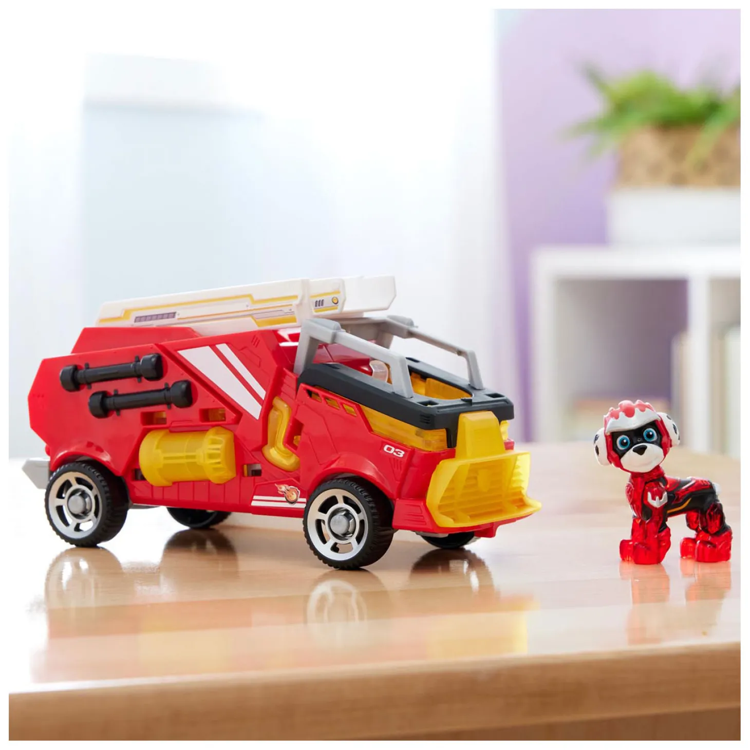 Marshall draagt zijn rode PAW Patrol The Mighty Movie-uniform, met doorzichtige delen en een coole helm. Klik Marshall op de stoel van zijn reddingsbrandweerauto om de verlichting in meerdere delen van het voertuig te activeren. Kijk hoe zijn pootjes oplichten om de reddingsacties nog spannender te maken en rol zijn reddingsvoertuig van de ene missie naar de andere. Met PAW Patrol-speelgoed kunnen kinderen hun fantasie de vrije loop laten en hun motorische vaardigheden ontwikkelen met fantasiespel terwijl ze hun favoriete scènes uit de film opnieuw beleven.