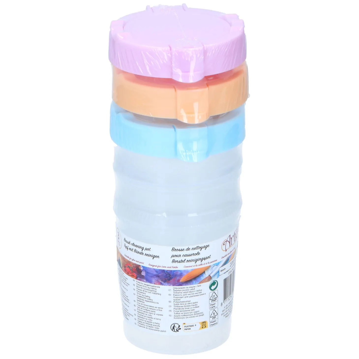 Set van 3 kunststof potjes om je penseel in te schoon te maken. Met 3 verschillende kleuren deksels en clipsluiting.