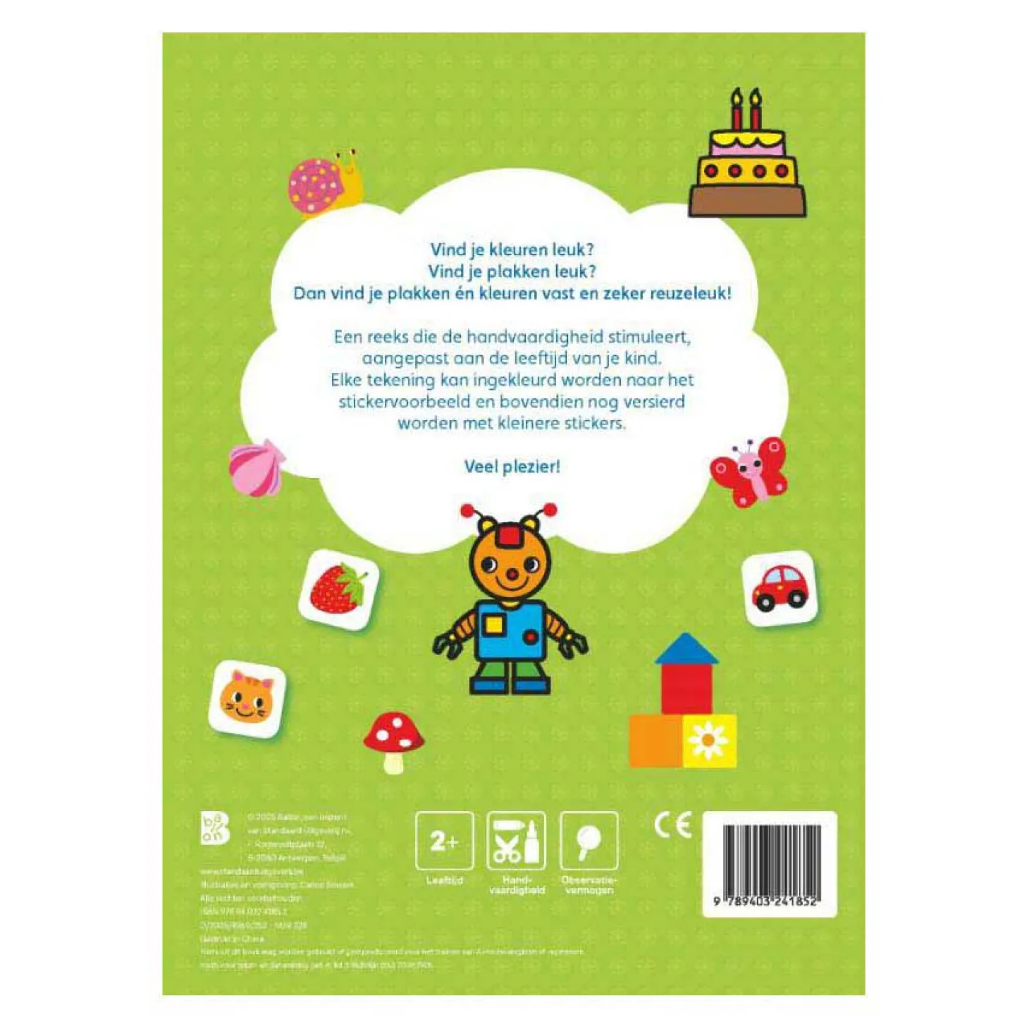 Een reeks die de handvaardigheid stimuleert, aangepast aan de leeftijd van je kind. Elke tekening kan ingekleurd worden naar het stickervoorbeeld en bovendien nog versierd worden met kleinere stickers. Veel pleizer!