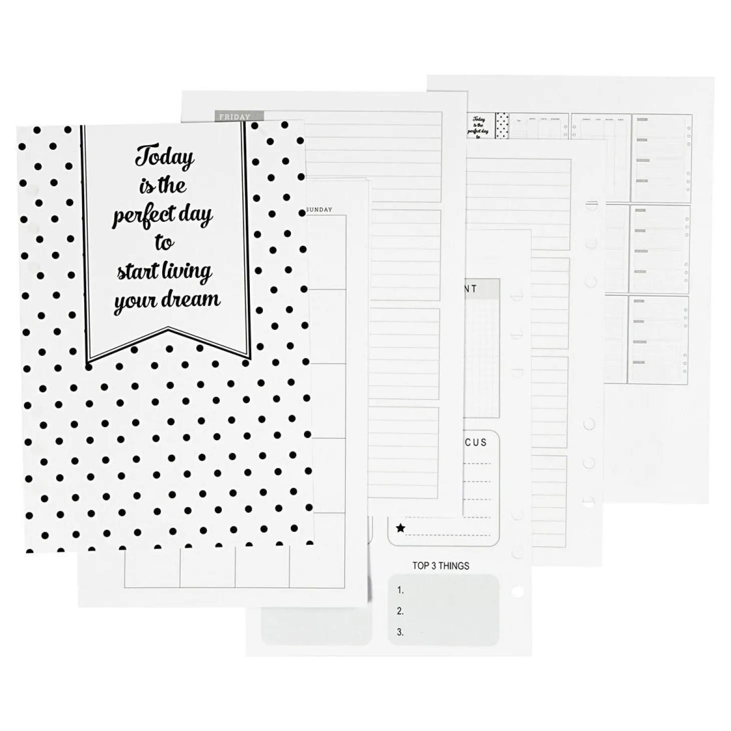 Losse planner pagina’s met 6 gaten. Perfect voor het maken van een bulletjournal, een creative journal of een reisverslag. De pagina’s zijn geschikt voor planners met artikelnr. 192648-192651