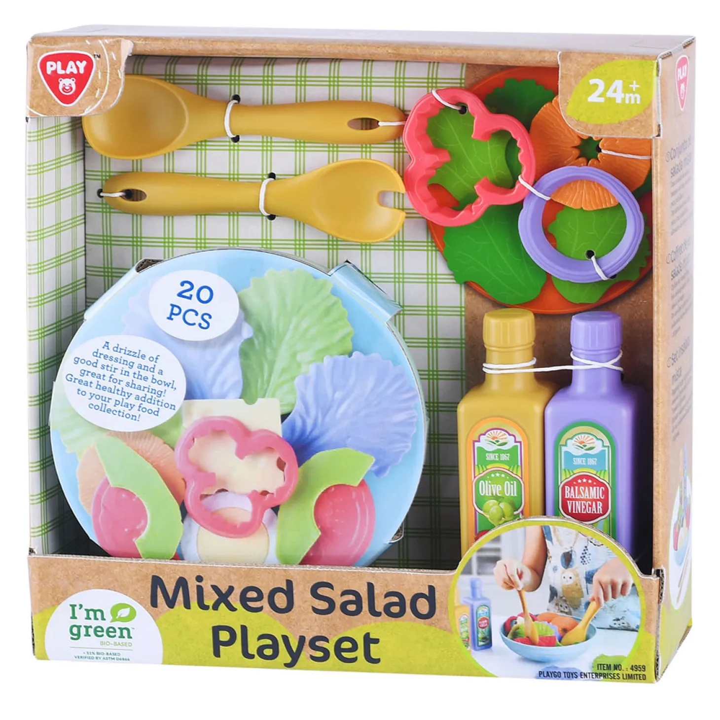 Maak een lekkere en gezonde salade met deze salade speelset! Haal de slakom tevoorschijn en kies de ingrediënten die jij in je salade wilt hebben! Zoek een lekkere dressing uit en mix alles goed door elkaar. De salade is nu klaar en het ideale voorgerecht! De set bestaat uit 20 onderdelen en is gemaakt van biologisch plastic. Geschikt voor kinderen vanaf 24 maanden.