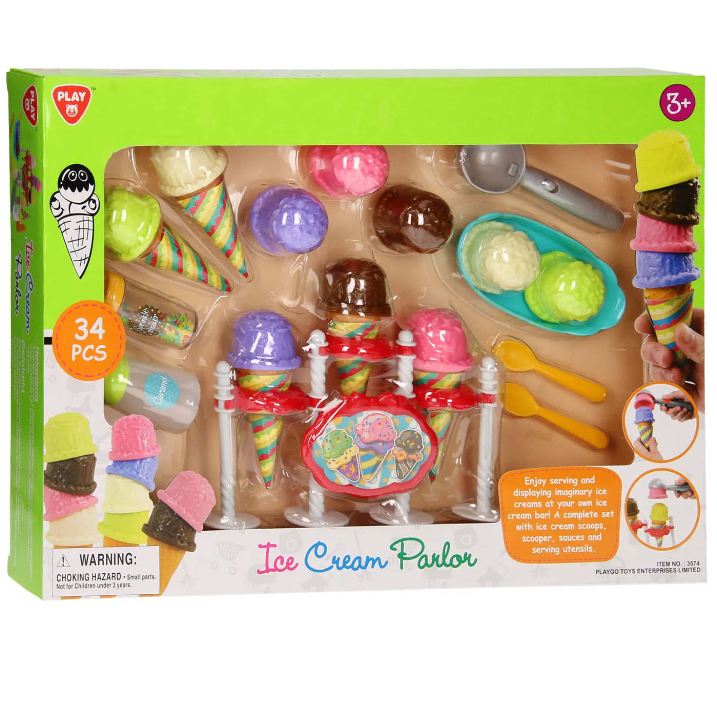 De ijsjesset bestaat uit 5 bollen schepijs, 5 ijshoorntjes (lengte 10 cm), 5 ijshoorntjes papier, een ijsbakje, 2 lepels, een busje met sprinkles, een flesje voor caramel, een ijsscheplepel en een standaard om de ijsjes erin te zetten.