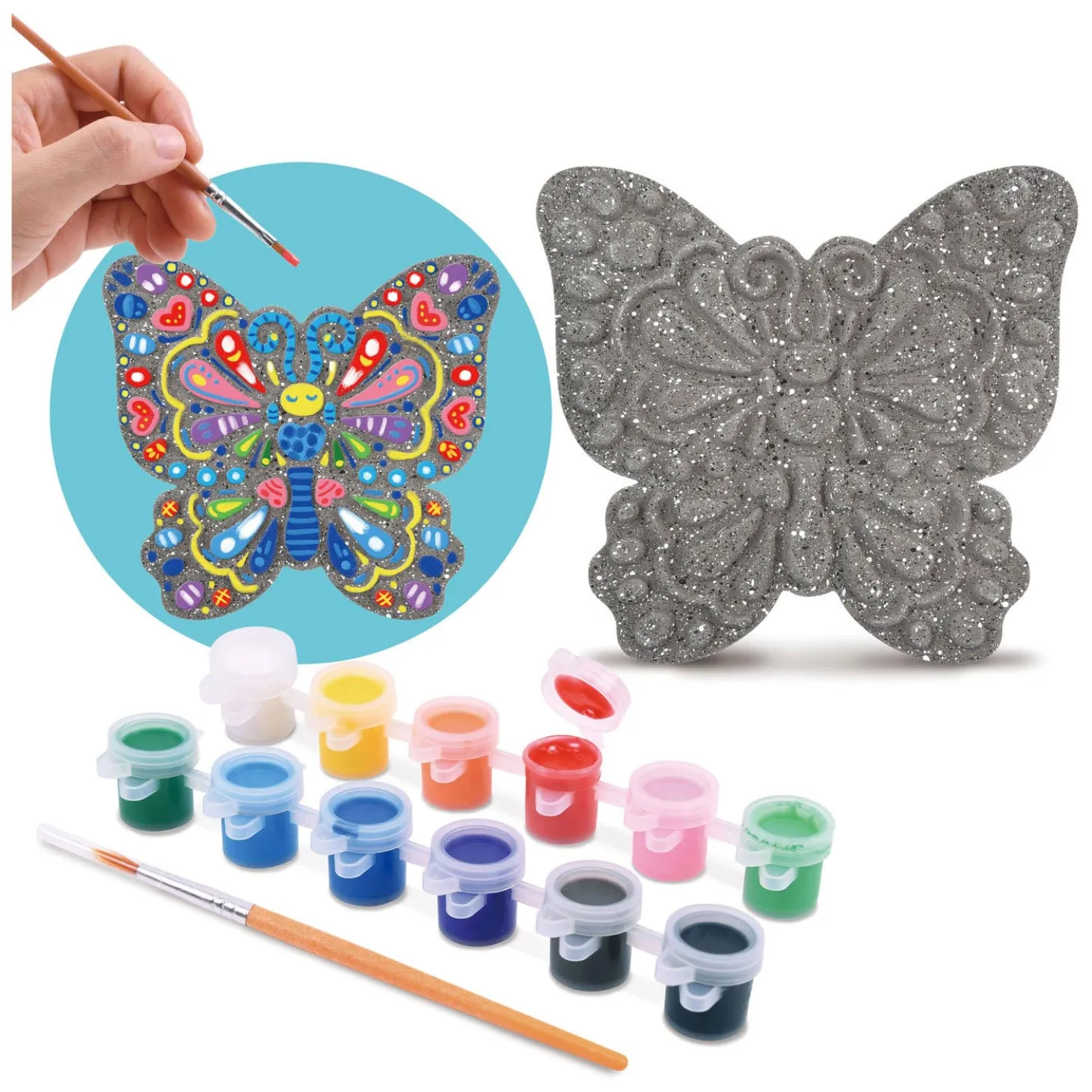 Schilderset van Play voor het maken van je eigen stepping stone in vlindervorm voor in de tuin. De cementen vlinder wordt geleverd met een penseel en 12 potjes verf in vrolijke kleuren.
