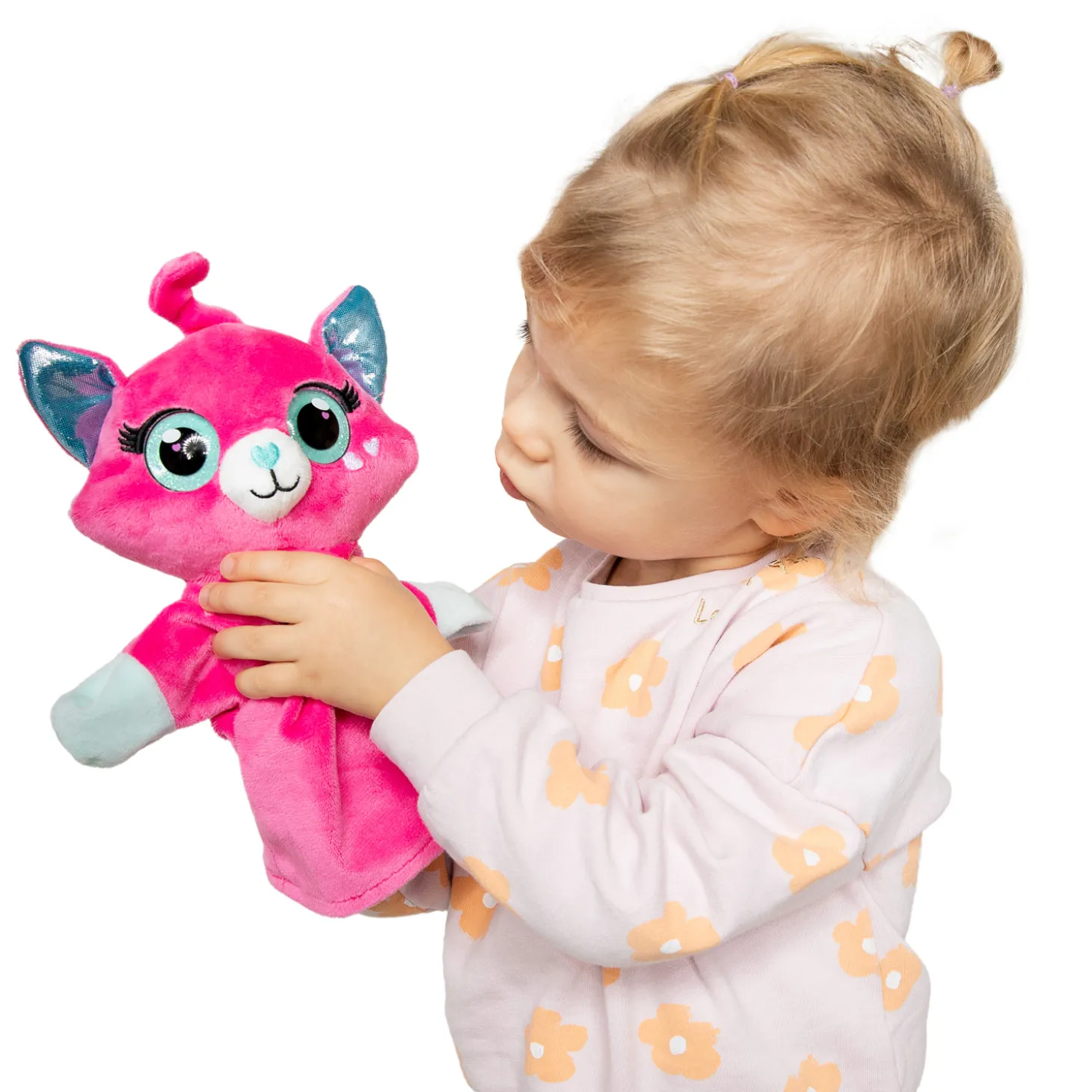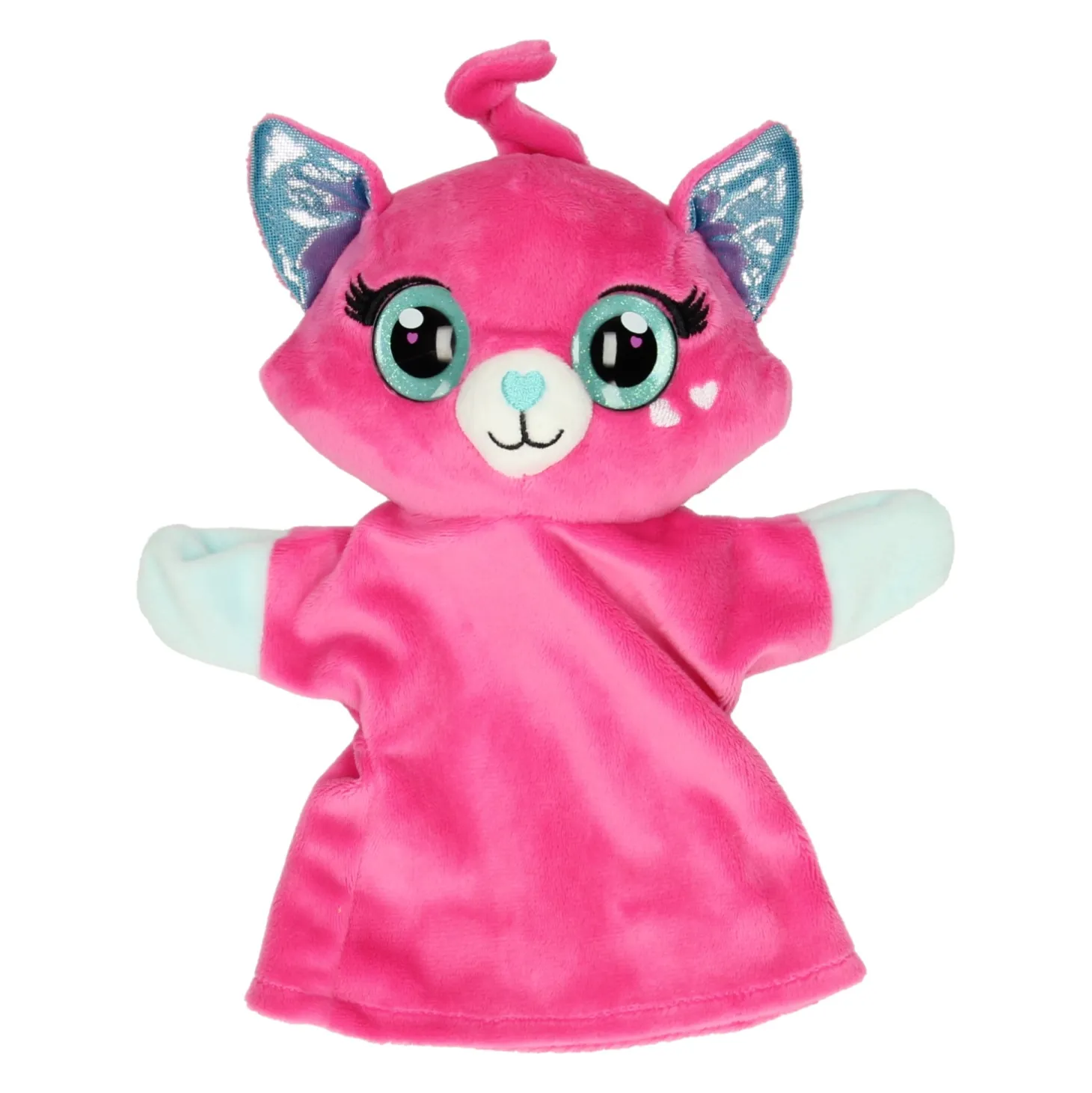 Deze schattige poezenhandpop is niet alleen superleuk om naar te kijken, ze is ook nog eens ultiem zacht! De kat heeft een ulrazacht, roze vachtje en grote glitterogen. Ook haar oren zijn glanzend blauw. Miauw! De handpop is gemaakt van super soft polyester en is wasbaar met de hand. De handpop is ca. 27 x 24 centimeter groot.