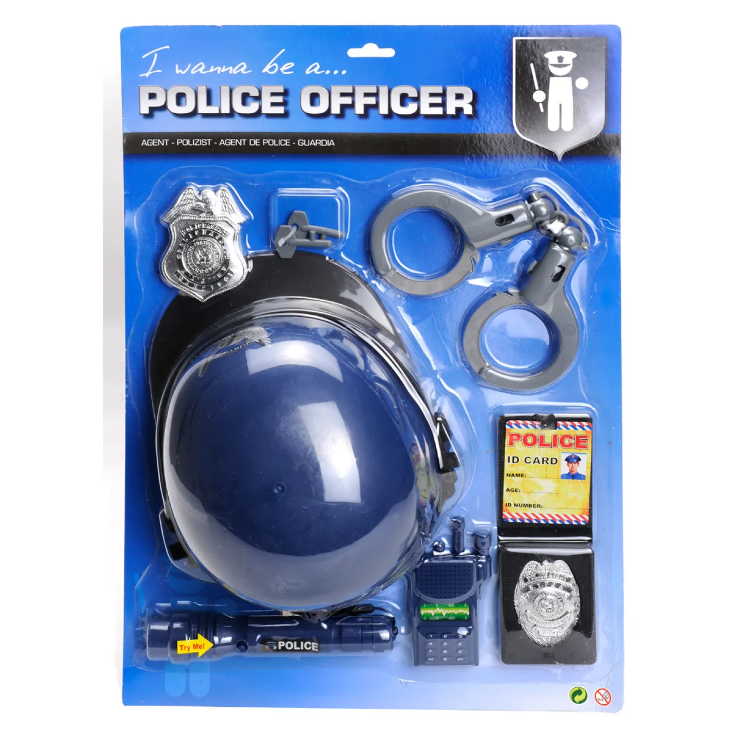 Politie speelset bestaande uit een helm, batch, handboeien, penning, telefoon en zaklamp.