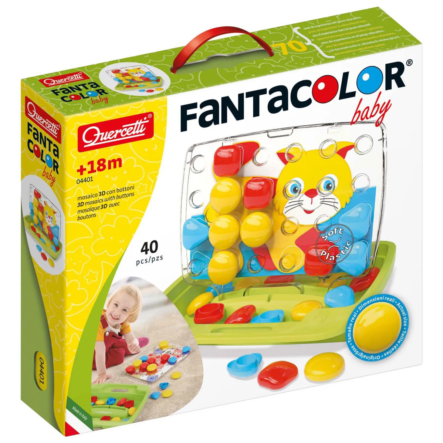 Maak de mooiste afbeeldingen door de grote gekleurde knoppen op de juiste plaats in het bord te plaatsen. De knoppen hebben 3 verschillende vormen die gekoppeld zijn aan een primaire kleur, zodat ze gemakkelijk te onderscheiden zijn. In de set vind je 8 verschillende vrolijke platen in zowel kleur als zwart/wit. Quercetti Fantacolor baby insteekmozaïek is een leerzaam spel wat helpt bij het ontwikkelen van hand-oog coördinatie, perceptie van kleuren en de fijne motoriek. Het stevige bord en de zachte kunststof knoppen zijn speciaal ontworpen voor baby’s.