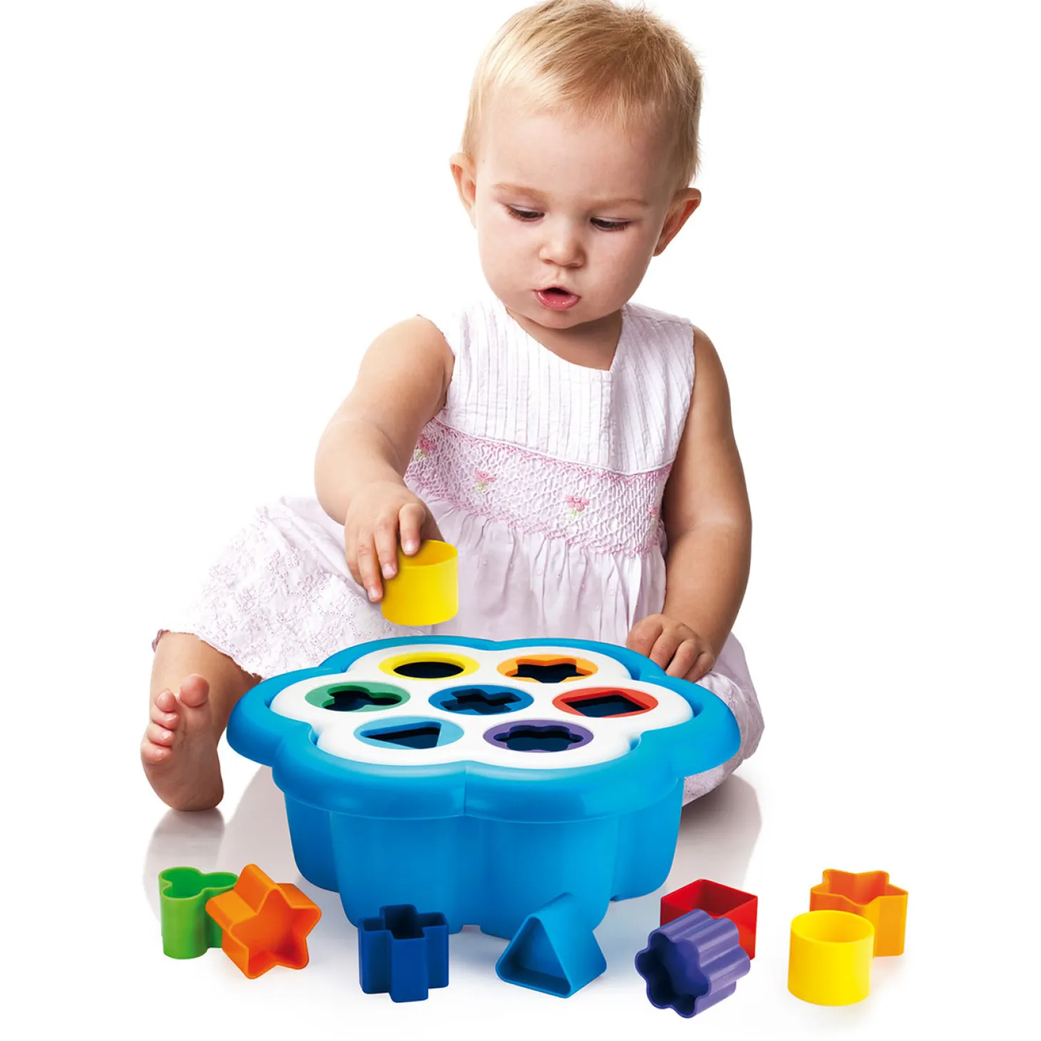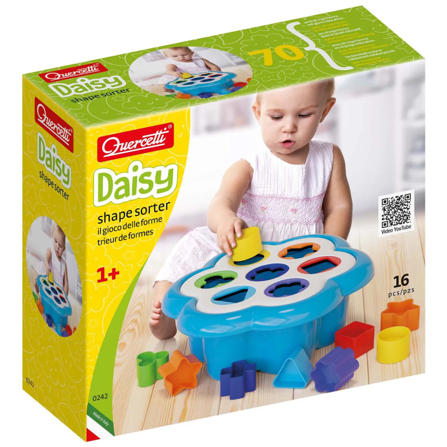 De Quercetti tijdloze favoriet: de vormsorteerder. Het heeft de vorm van een bloem, heeft zeven gaten in verschillende maten en vrolijke kleuren die uw kind zal leren herkennen. Elke vorm wordt gecoördineerd met een eigen, unieke kleur zodat de kinderen gemakkelijk bij elkaar horende stukken kunnen vinden en deze kunnen sorteren op vorm en kleur door de juiste vorm in het juiste gat te laten vallen. Uitstekend voor de hand-oogcoördinatie. Alle 14 vormen passen makkelijk in de volumineuze emmer en is dus in zijn geheel makkelijk op te bergen. Geschikt voor kinderen vanaf 1 jaar.