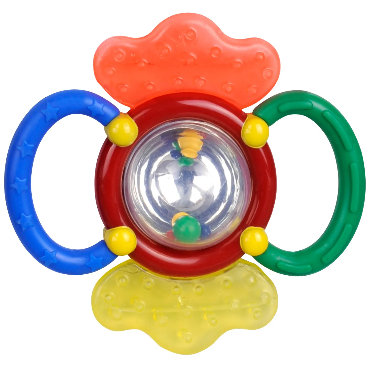 Veelzijdige rammelaar voor baby’s vanaf 3 maanden. Rammelaar, spiegel, bijtstukjes van 2 verschillende materialen.
