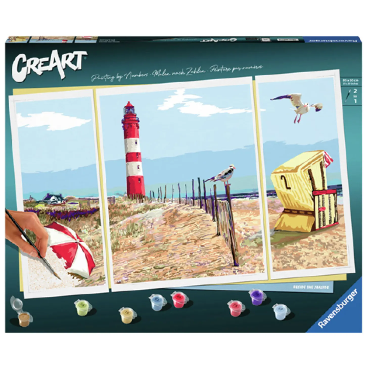 Schilderen op nummer van Ravensburger – iedereen kan schilderen! Dankzij de eenvoudige schildertechniek van schilderen op nummer is het kinderlijk eenvoudig de kunstenaar in jezelf wakker te maken! Dankzij de duidelijke schildervakjes ontstaat een klein en prachtig kunstwerk van 80,00 cm x 50,00 cm. De fijnere kleurnuanceringen zorgen voor een elegant kleurverloop en schaduwspel. Uitpakken en aan de slag, met de afbeelding van Beside the Seaside!