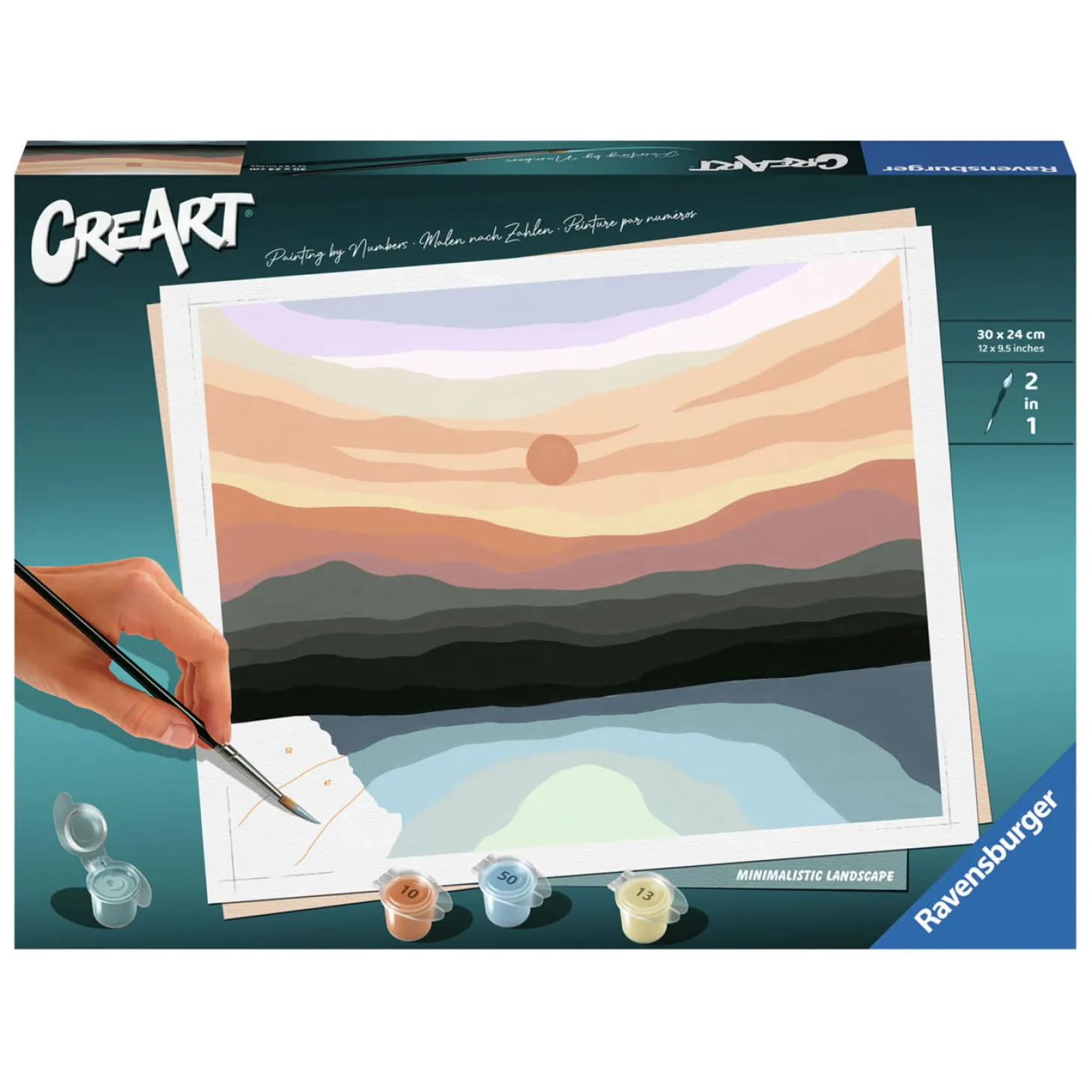 Schilderen op nummer van Ravensburger – iedereen kan schilderen! Dankzij de eenvoudige schildertechniek van schilderen op nummer is het kinderlijk eenvoudig de kunstenaar in jezelf wakker te maken! Dankzij de duidelijke schildervakjes ontstaat een klein en prachtig kunstwerk van 30,00 cm x 24 cm. De fijnere kleurnuanceringen zorgen voor een elegant kleurverloop en schaduwspel. Uitpakken en aan de slag, met de afbeelding van Minimalistisch landschap!