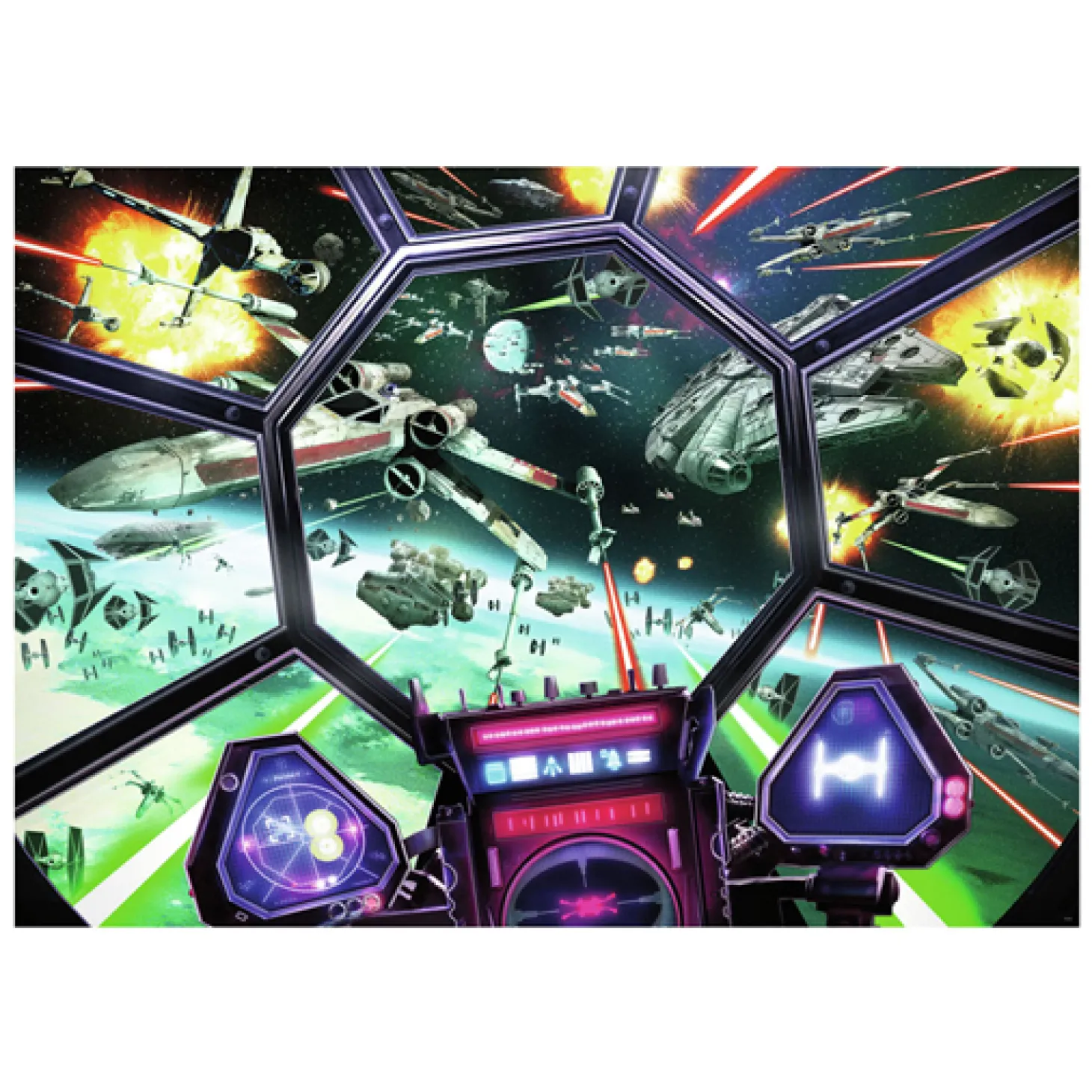Ontsnap uit de realiteit en stap in de wereld van Ravensburger puzzels. Deze Ravensburger puzzel van 1000 stukjes is geschikt voor zowel beginnende als ervaren puzzelaars. En omdat onze geliefde puzzels een standaard formaat hebben, kun je het resultaat inlijsten en ophangen. Dankzij de met de hand gemaakte stansmessen is de vormvariatie van de stukjes oneindig. Jong en oud zullen genieten van deze Star Wars: TIE Fighter Cockpit puzzel met 1000 stukjes.