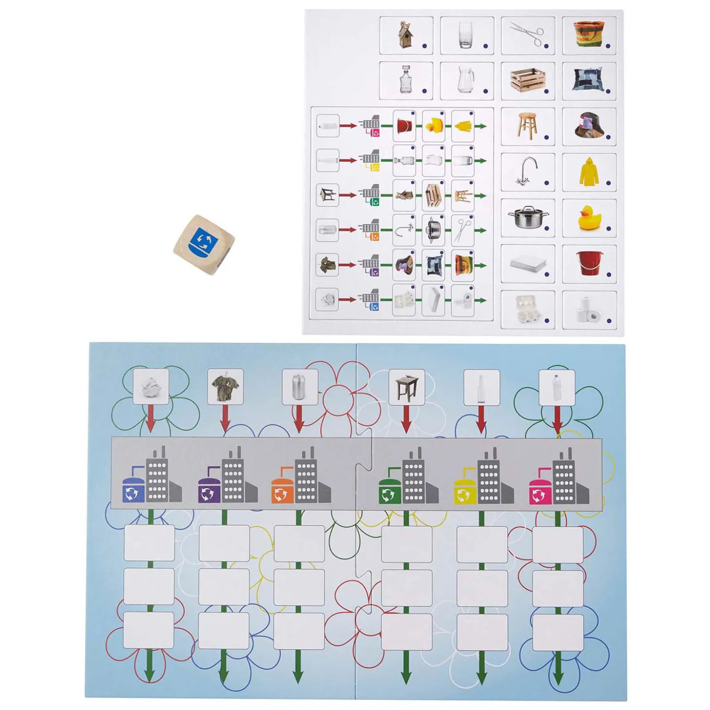 Om de beurt dobbelen de kinderen met de dobbelsteen, waarop 6 gekleurde fabrieken staan. Ze kijken op het spelbord welk materiaal in die kleur fabriek wordt gerecycled, pakken 1 recyclekaartje van een nieuw product en leggen dat kaartje onder die fabriek. De kinderen spelen door tot alle recyclekaartjes onder de fabrieken op het spelbord liggen. Met de controlekaart wordt gecontroleerd of alle kaartjes bij de juiste fabriek liggen.