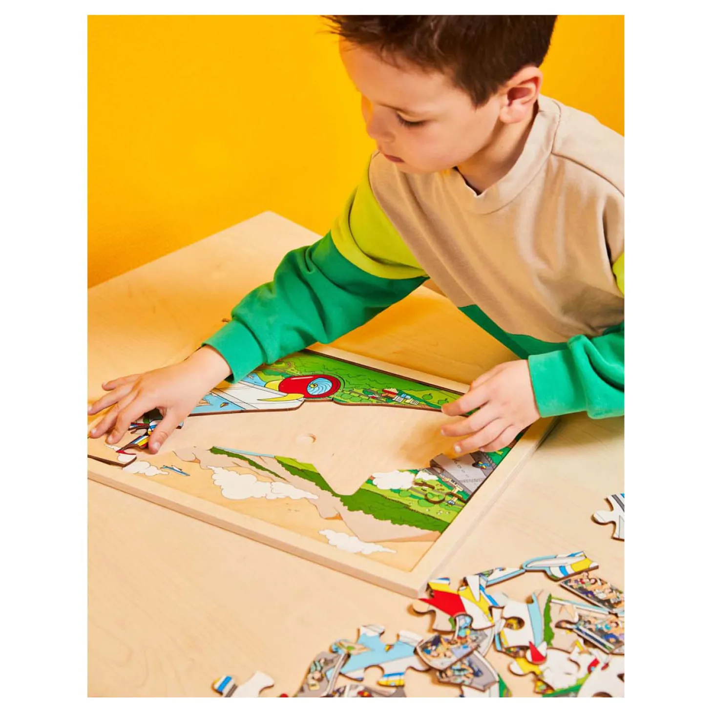 Grote, houten puzzel van een vliegtuig, die uit 2 lagen bestaat. De onderste laag heeft 25 stukjes en toont de binnenkant van het vliegtuig. De bovenste laag bestaat uit 35 stukjes en toont de buitenkant van het voertuig, met daarbij de omgeving. Formaat 40 28 cm. Om deze puzzel te beschermen tegen slijtage bestel je er een kunststof afdekplaaten van 40 x 28 cm bij.