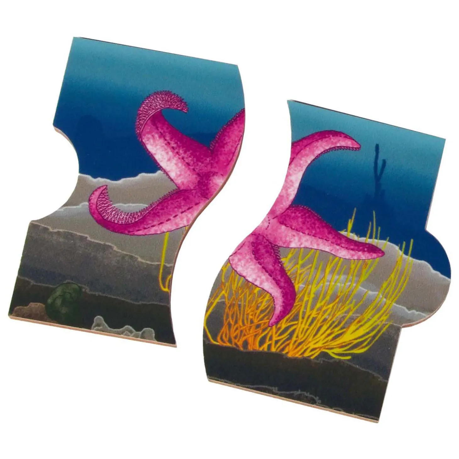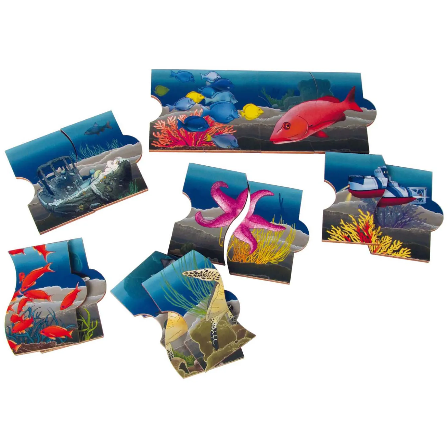Ga op je knieën op zoek naar de twee puzzelstukken die samen een zeedier vormen. Heb je ze allemaal gevonden, maak er dan een lange rij van. Het eerste dier van de rij sluit weer aan bij het laatste dier van de rij. Zo kan het steeds verder gaan en beleef je eindeloos puzzelplezier. Deze vloerpuzzel heeft een formaat van 112 x 12 cm.