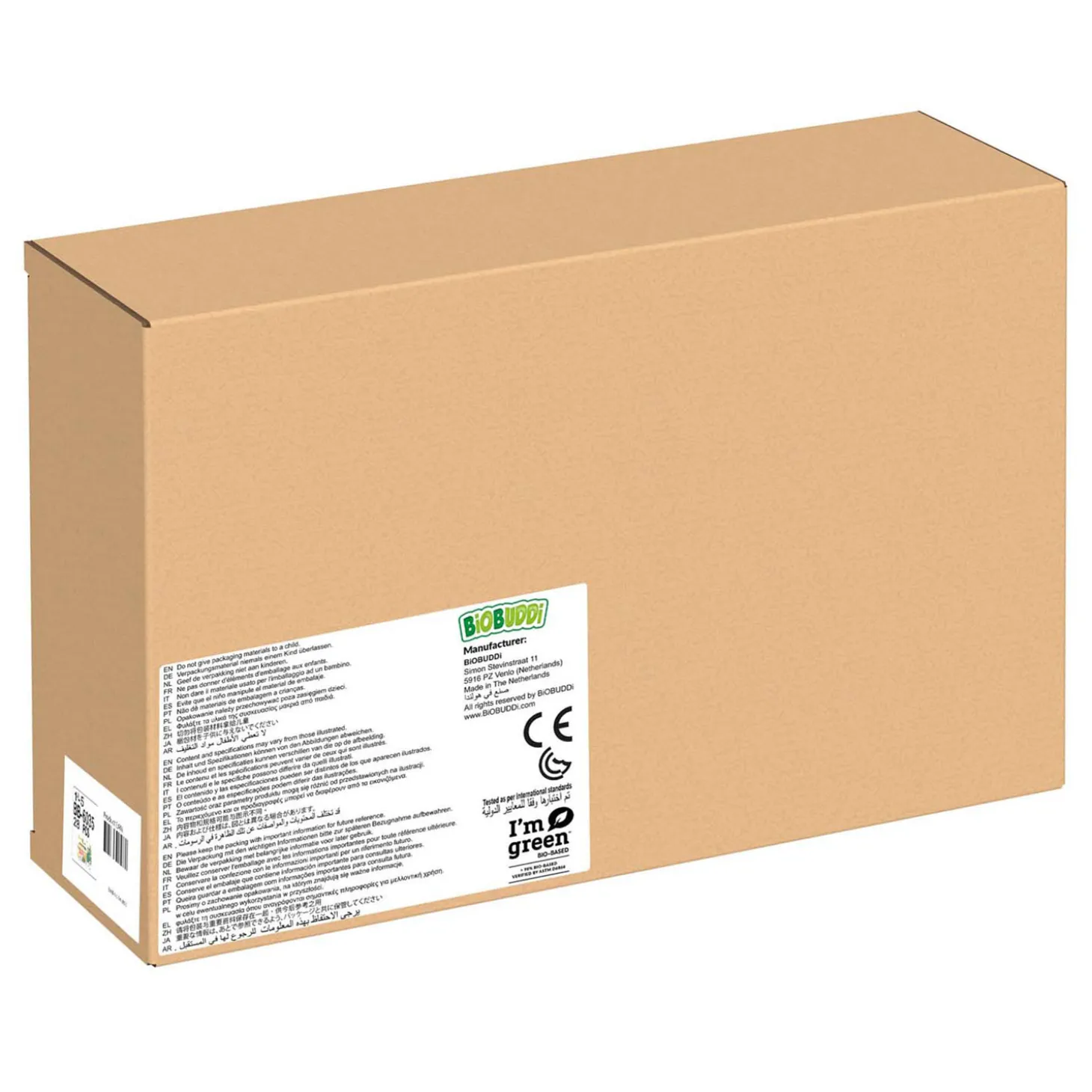 Gemaakt van Bioplastic en verpakt in een kartonnen verpakking.
