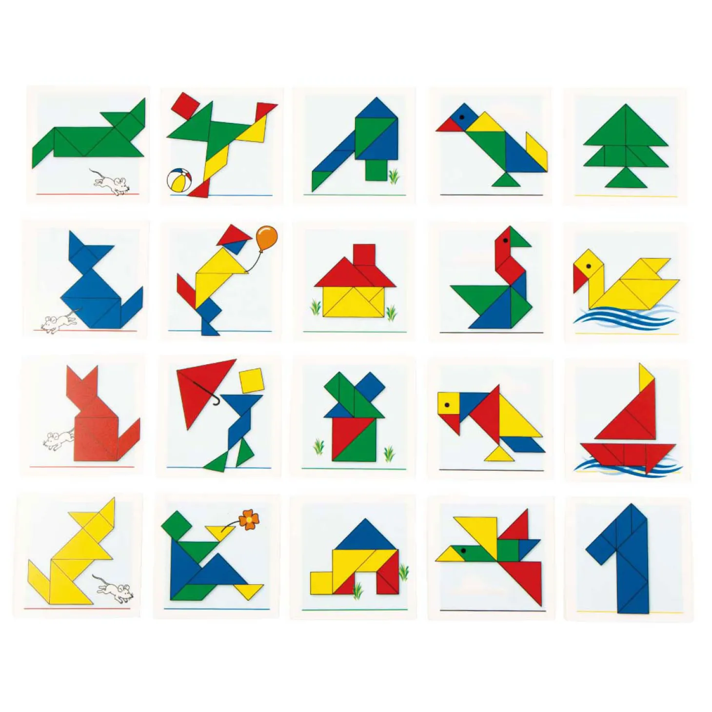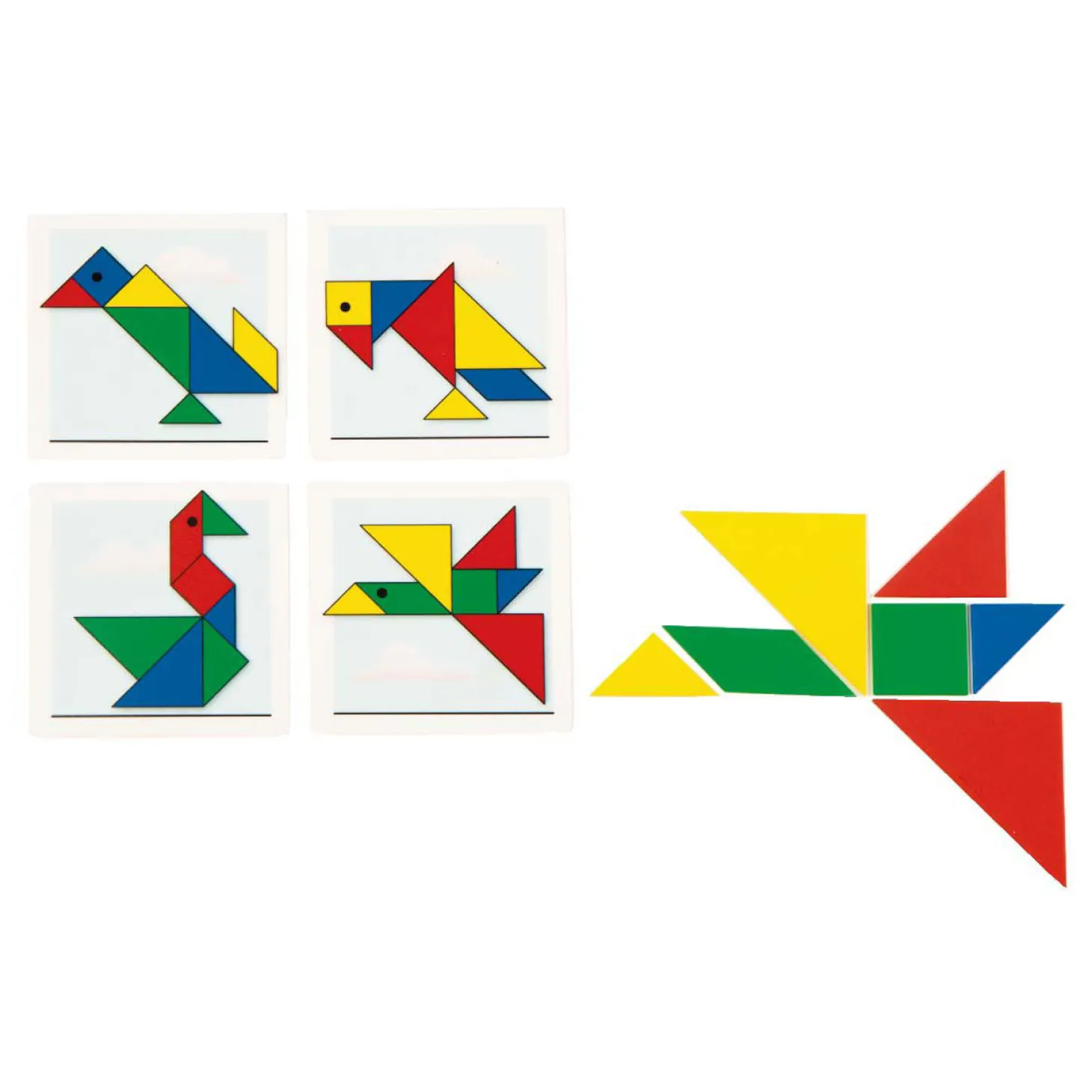 Een tangram is een vierkant dat is opgebouw uit 5 driehoeken, een vierkant en een ruit. Door te schuiven, te draaien en oppervlakken te combineren tot een nieuw geheel, kun je hiermee de meest uitenlopende figuren leggen. In deze tangramkist vind je diverse series: met mensen, vogels, huizen, katten en een met verschillende vormen. Door de duidelijke voorbeelden is dit spel geschikt voor 2 tot 4 kinderen van 5 jaar. je ontvangt: een houten kist met deksel, 20 kunststof voorbeeldkaarten van 10 x 10 cm, 4 kunststof tangrammen van 10 x 10 cm in 4 verschillende kleuren en een handleiding.