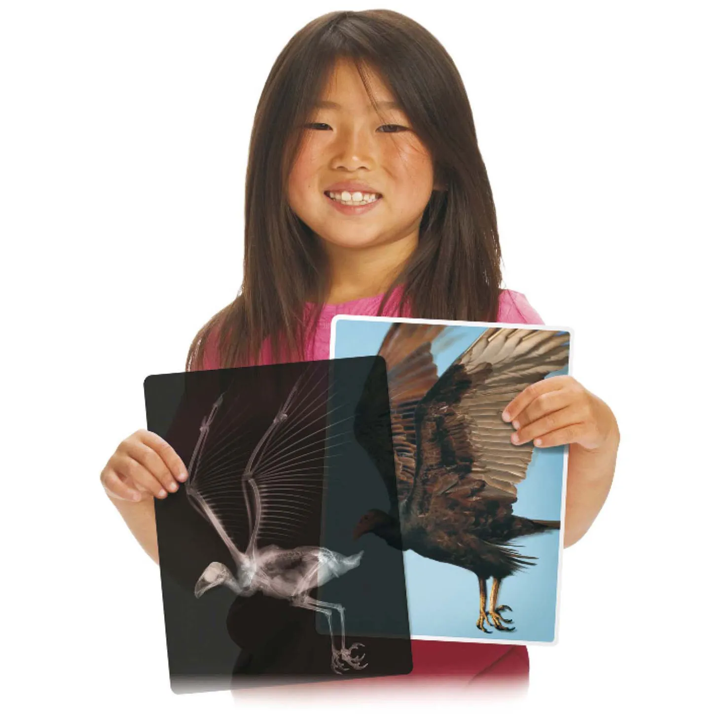 Bestudeer de overeenkomsten en verschillen tussen dieren op levensechte röntgenprints. De set bestaat uit 14 röntgenprints, 14 overeenkomstige beelden van dieren van 10 tot 25 cm en een handleiding.