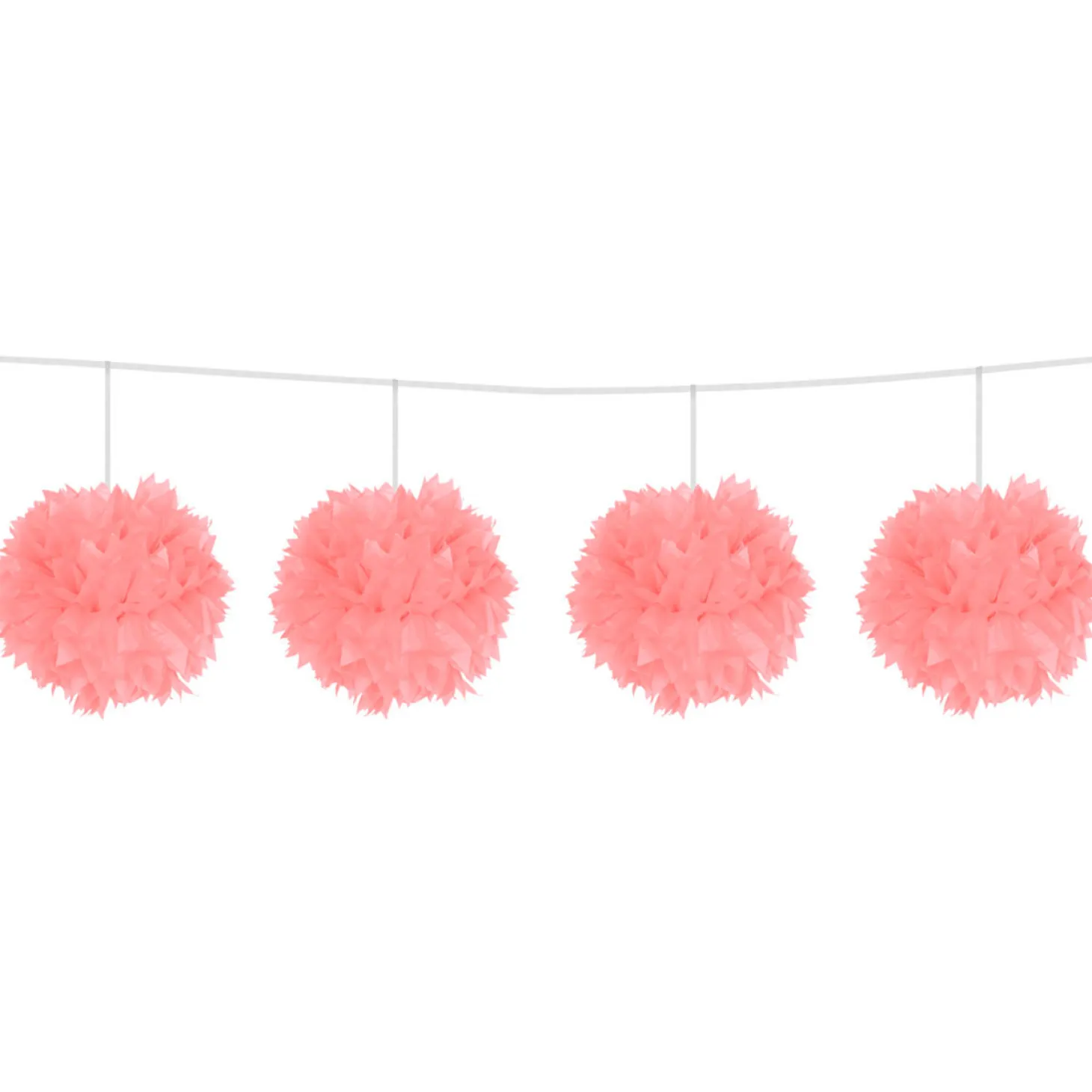 Leuke slinger met roze pompoms. De pompoms hebben een doorsnede van 12 cm en de slinger is 3 meter lang.