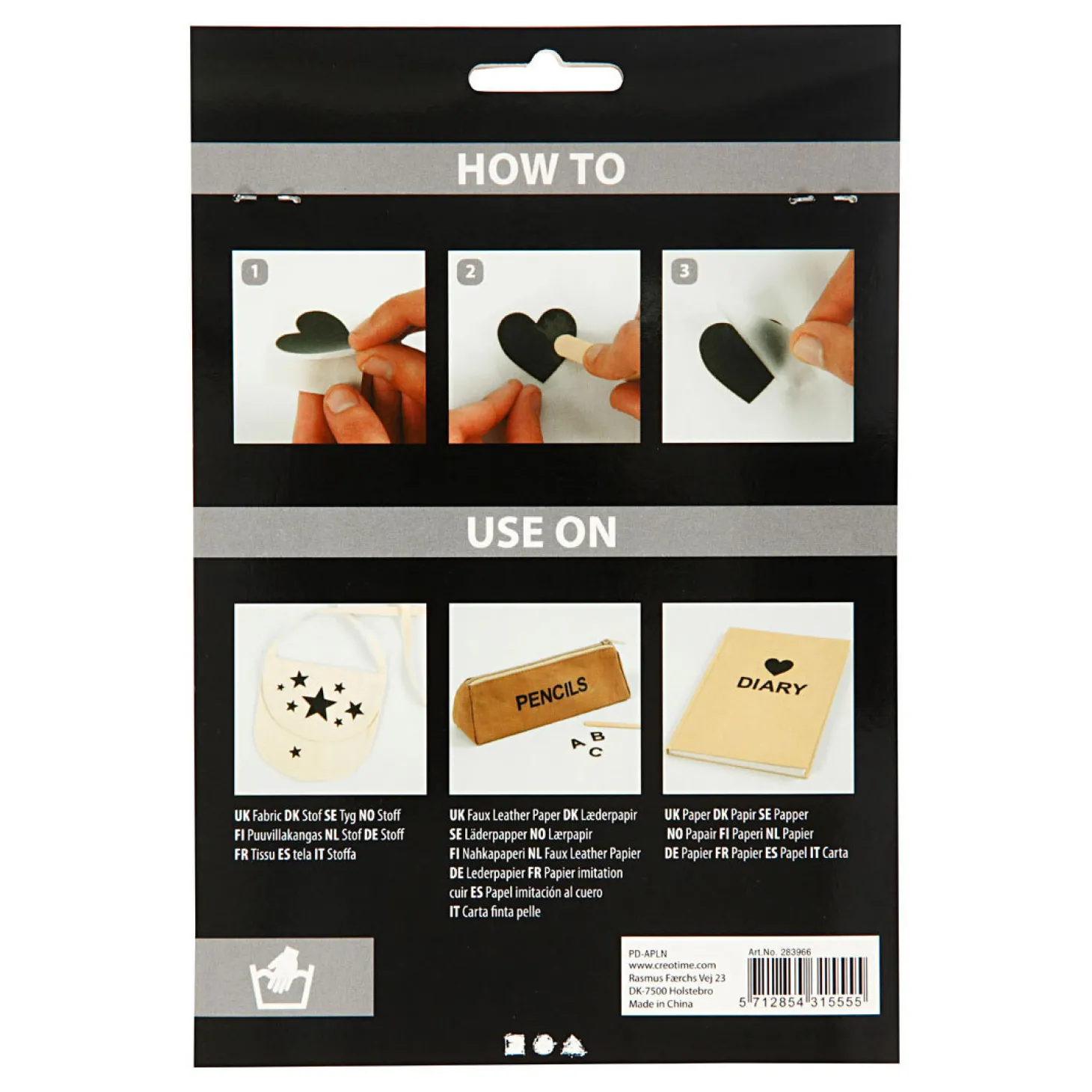 Transfer labels voor textiel, faux leather papier e.d. De motieven worden op het item gewreven met bijgeleverd gereedschap. Handwas. Inhoud: 2 vellen en 1 houten gereedschap