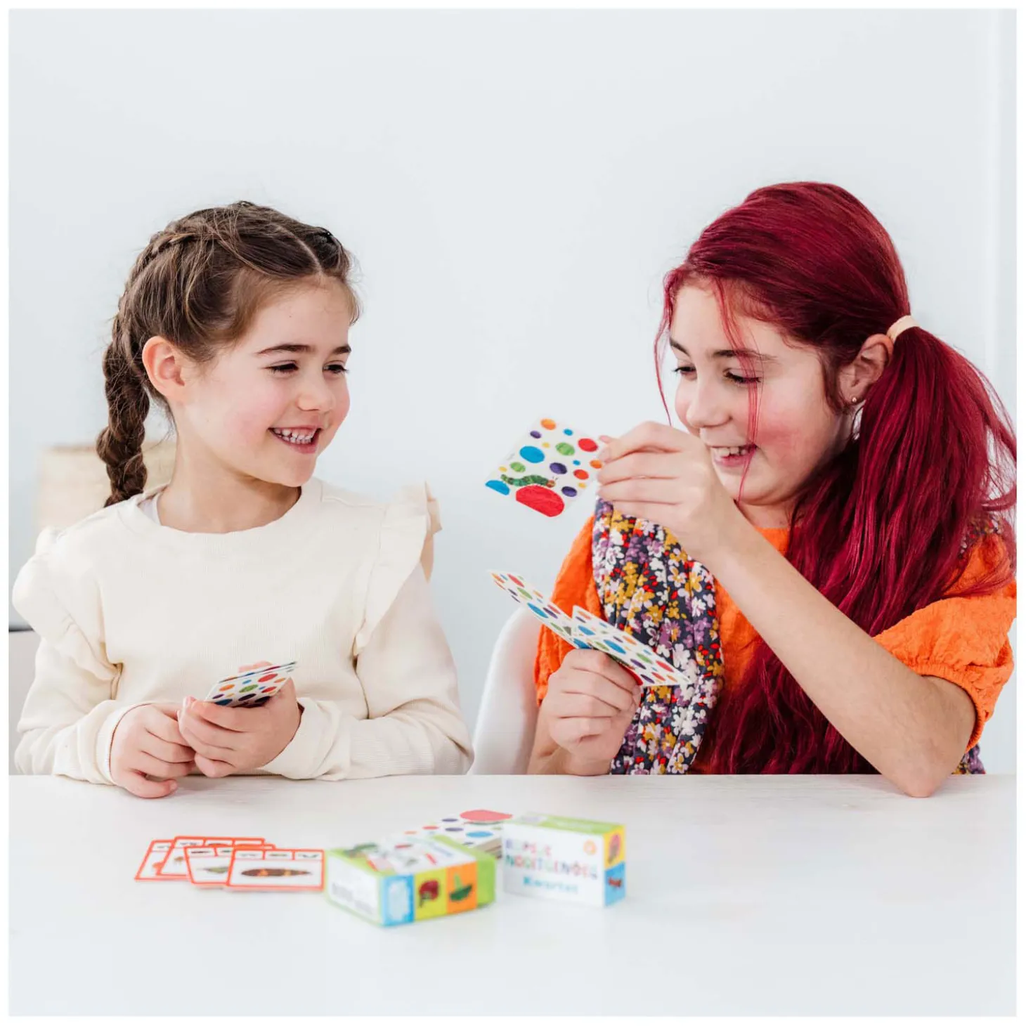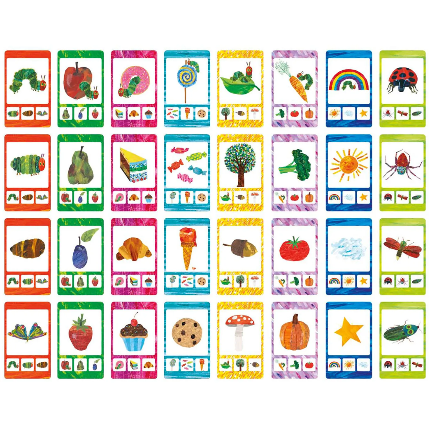 Het kwartetspel bestaat uit 32 kartonnen kwartetkaarten in vrolijke kleuren, met daarop leuke en herkenbare illustraties uit het populaire Rupsje Nooitgenoeg-verhaal.