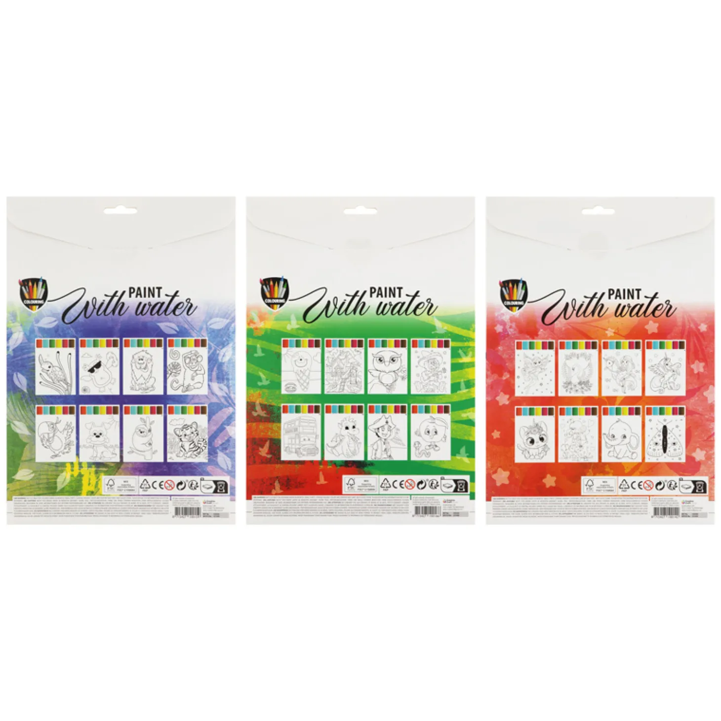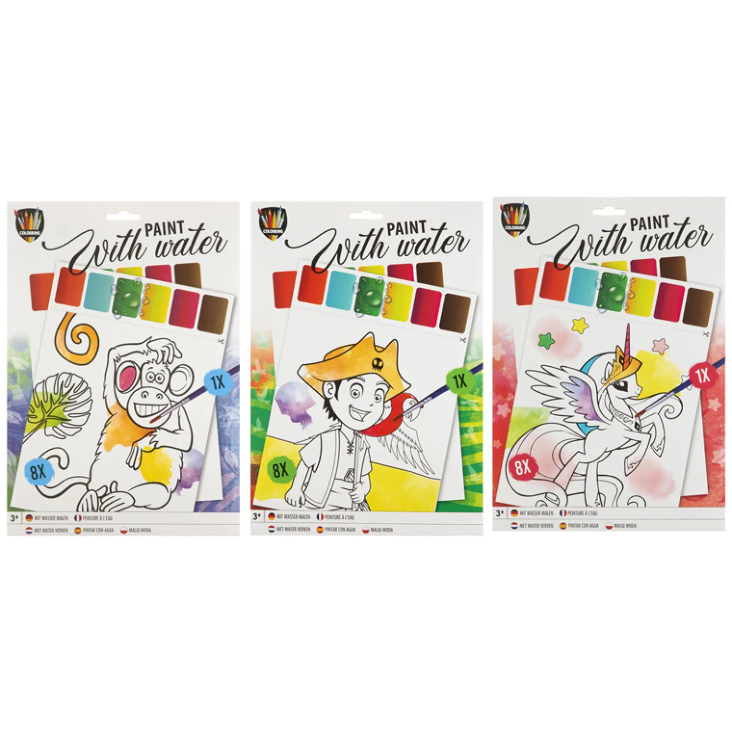 De set bevat ook een penseel maar geen verfpotjes. Hoe kan ik dan verven, vraag je je misschien af? Elke tekening heeft bovenaan een strook met kleuren. Maak je penseel nat met wat water, strijk over de kleuren heen en kijk hoe de magie te werk gaat!