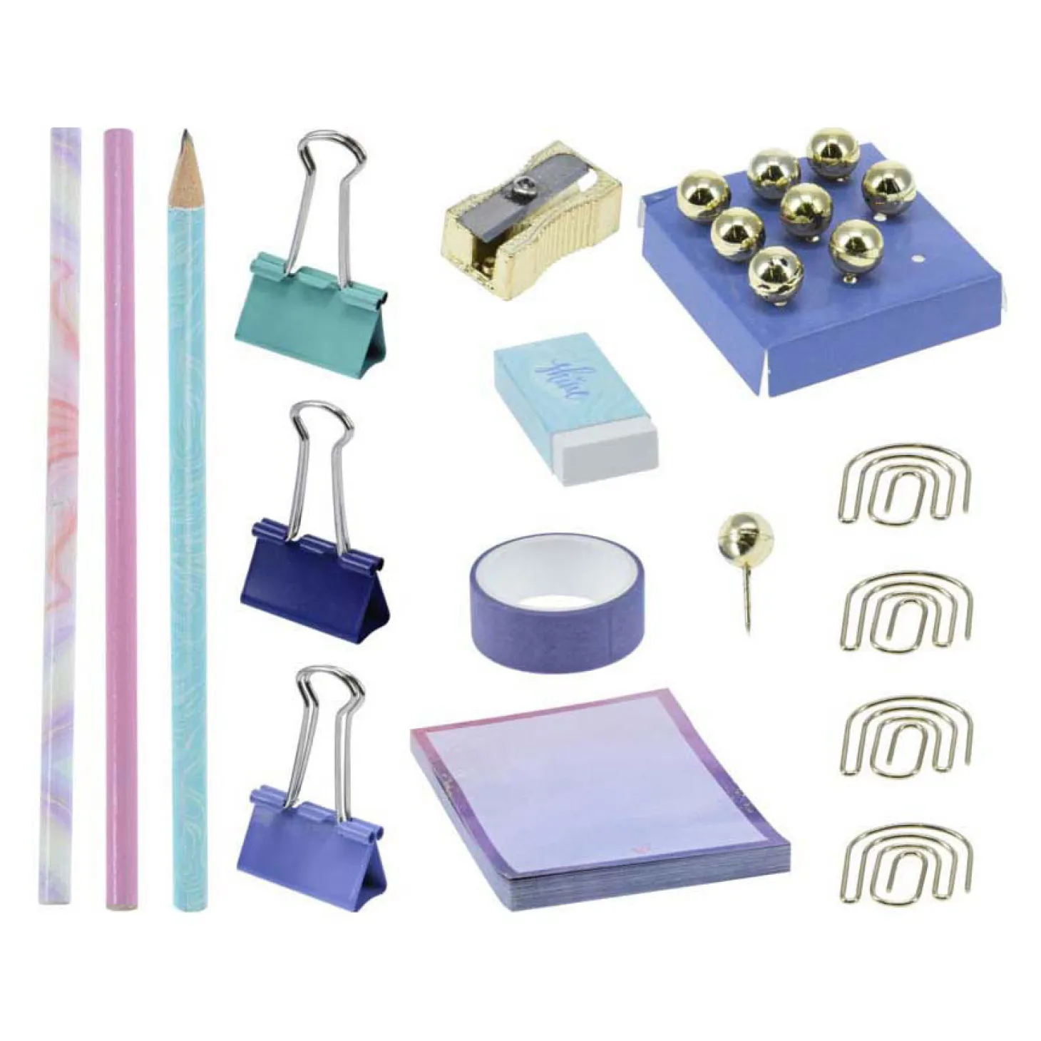Deze mooie GIRLPOWER schrijfwarenset zit vol met leuke accessoires voor op je bureau! De stijlvol vormgegeven set heeft mooie tinten roze, paars en bauw met goudkleurige details in de punaises, puntenslijper en paperclips. Verder bestaat de set uit 3 grijze potloden, 3 clips, een gum, een set zelfklevende plakbriefjes en een rol paarse tape. Zet de schrijfwaren in een mooie pennenhouder of stop ze in je etui voor mee naar school!