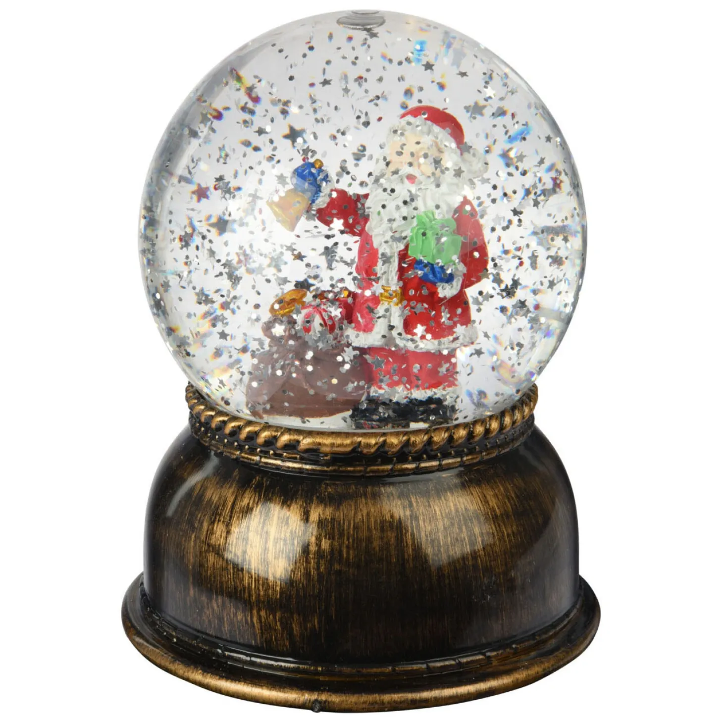 Mooie schudbol op klassieke voet met glitterende kerststerren en vrolijke kerstfiguren. Een prachtige accessoire om bij weg te dromen! Leuk om neer te zetten of cadeau te geven. Schud de bol met water en laat de zilveren sterretjes door de bol dwarrelen. De sneeuwbol is 14 centimeter groot en heeft ledverlichting, werkend op batterijen (niet inbegrepen). Niet geschikt voor kinderen jonger dan 3 jaar.Prijs per stuk, verschillende uitvoeringen/kleuren worden door elkaar geleverd.