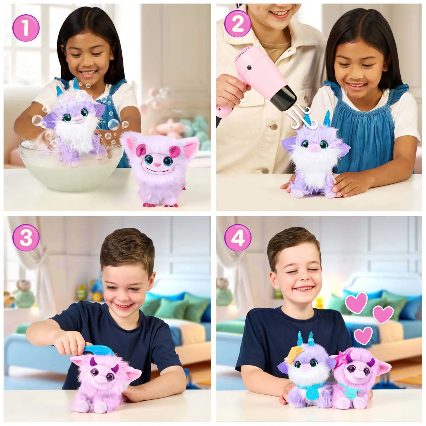 Na het wassen en afdrogen is jouw Scruff a Luv nog niet zo zacht, daarvoor moet je haar eerst goed verwennen met een warme föhn (niet meegeleverd), zodat haar vacht superglanzend en zacht wordt. Gebruik de kam, halsband en haarclip om je knuffel helemaal naar wens te stylen. Elk diertje is uniek en de accessoires kunnen per verrassing verschillen. Leeftijdsindicatie: 2 jaar+