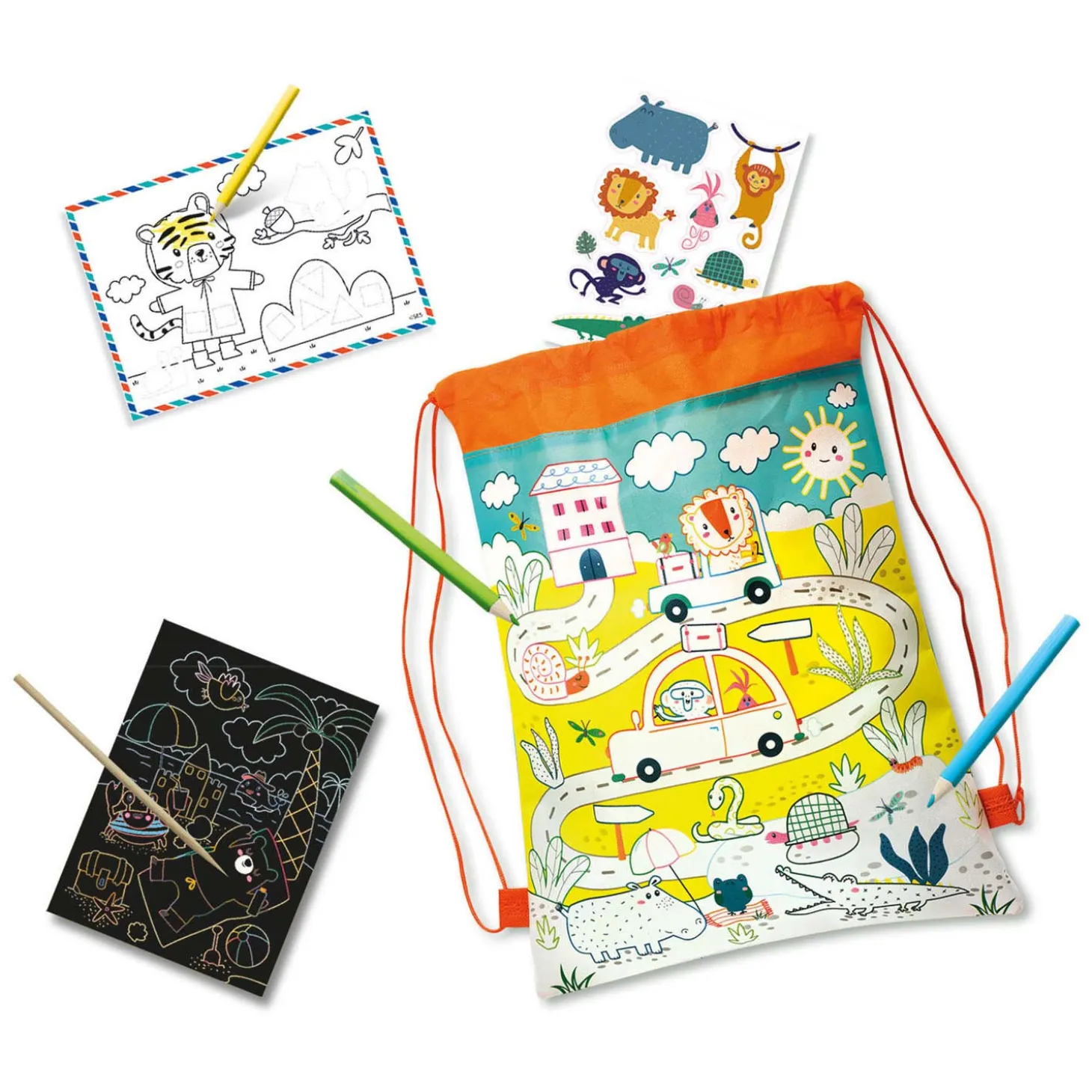 De activiteiten reistas is een rugtas die kan worden ingekleurd, met bijgevoegd 3 scratchkaarten, verschillende stickervellen, kleurpotloden en ansichtkaarten om in te kleuren. De tas is groot en biedt voldoende extra ruimte voor knuffels en speelgoed.