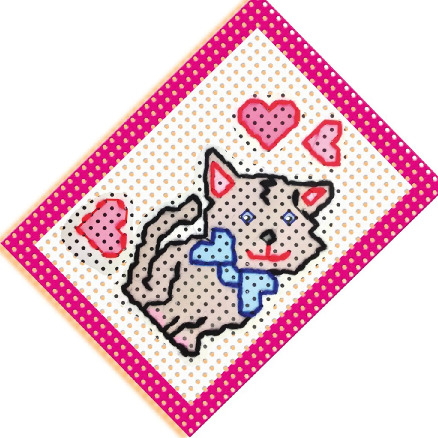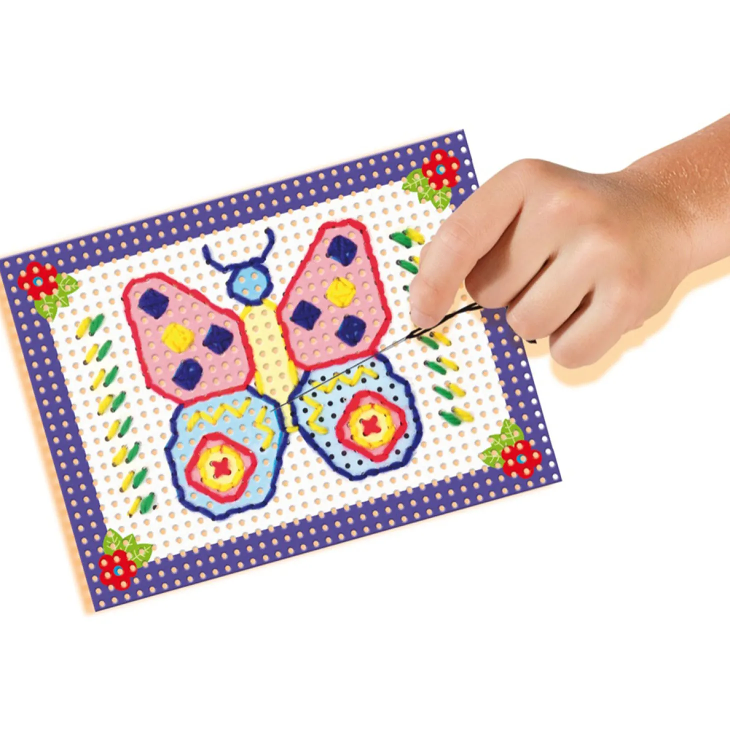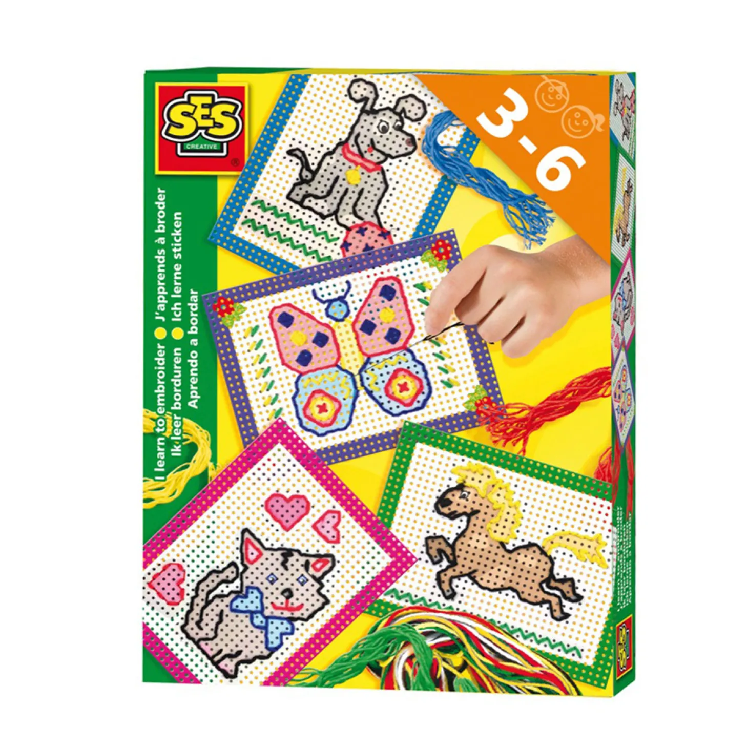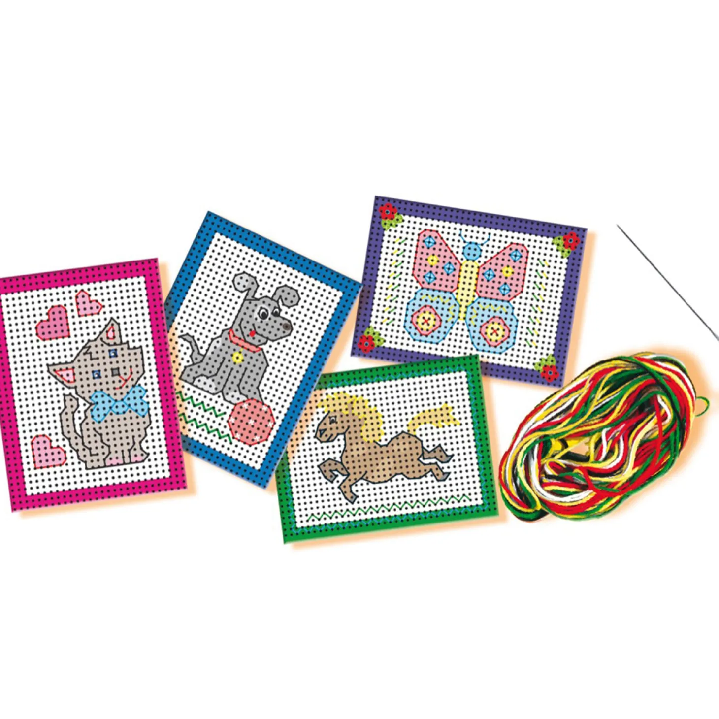 In de verpakking vind je 4 voorbedrukte borduurkaarten, veilige stompe naald, vingerhoedje en verschillende kleuren garen. Veel borduurplezier!