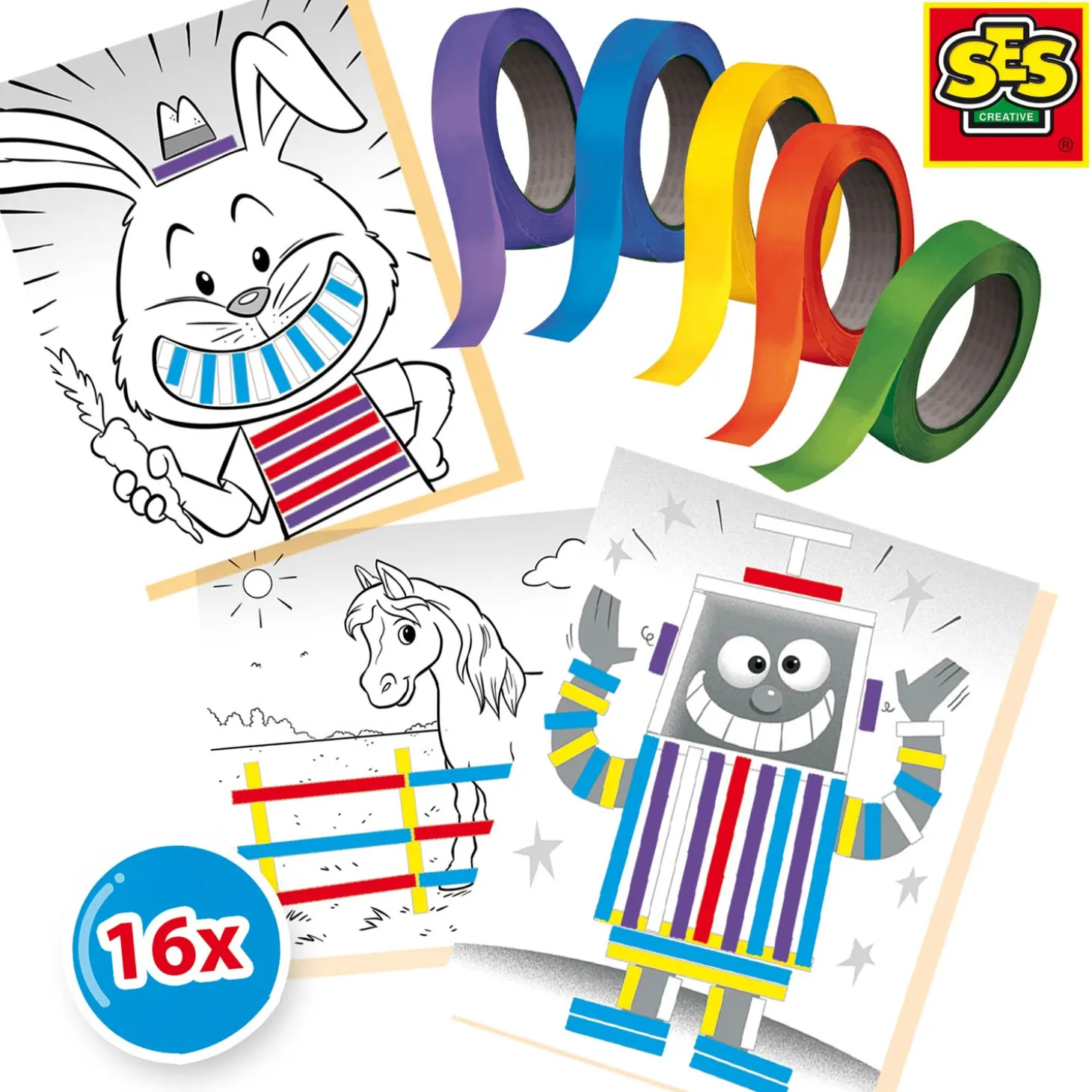 In de verpakking zitten maar liefst 16 voorbedrukte kaarten met leuke plakopdrachtjes en vijf rollen gekleurd plaktape. Veel plezier met plakken!