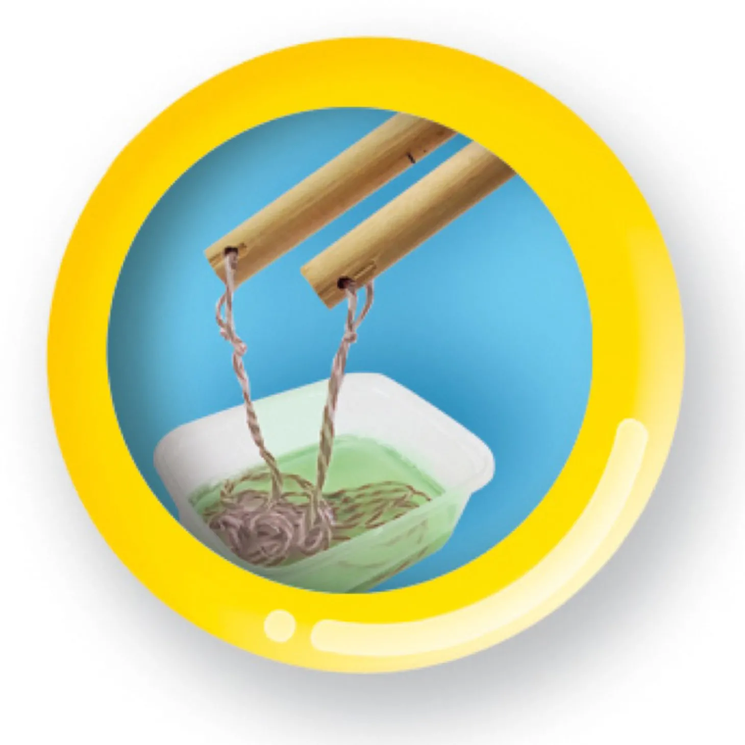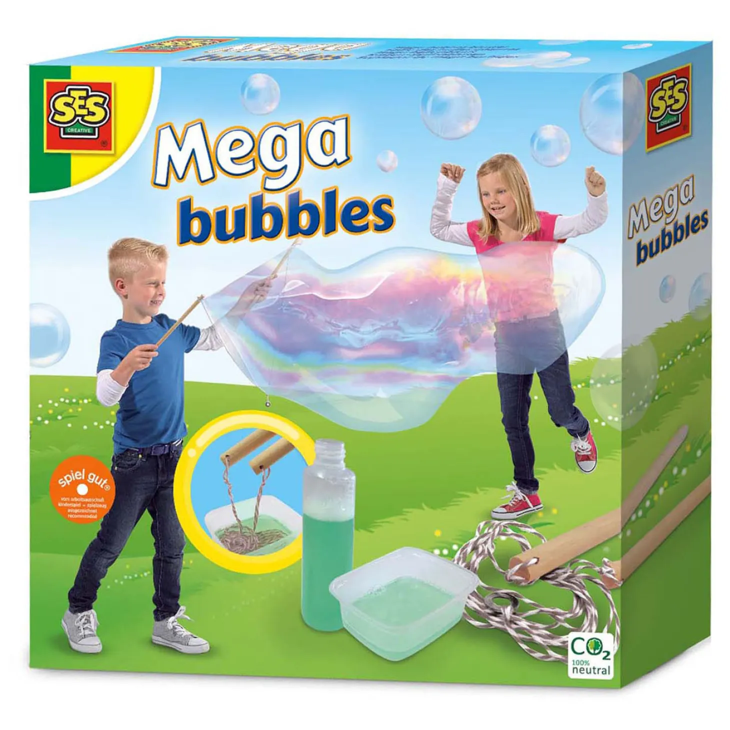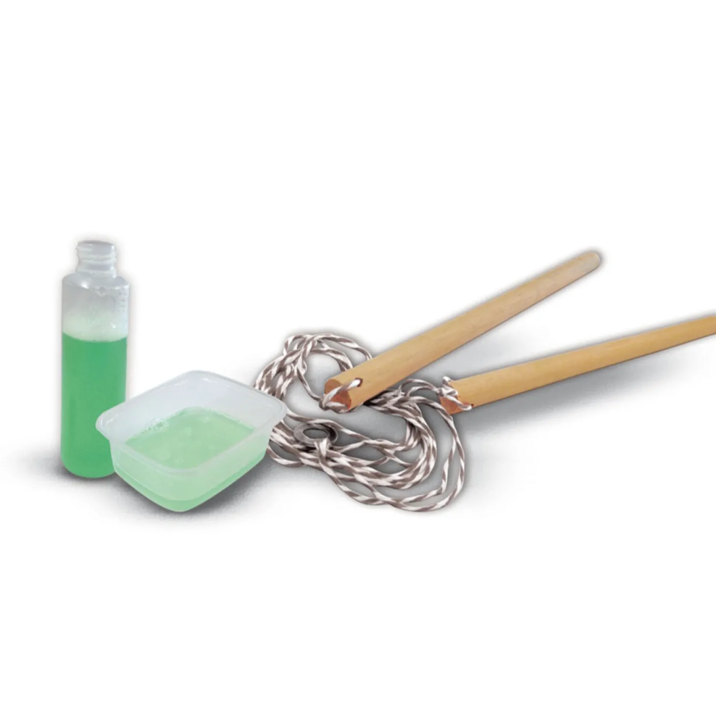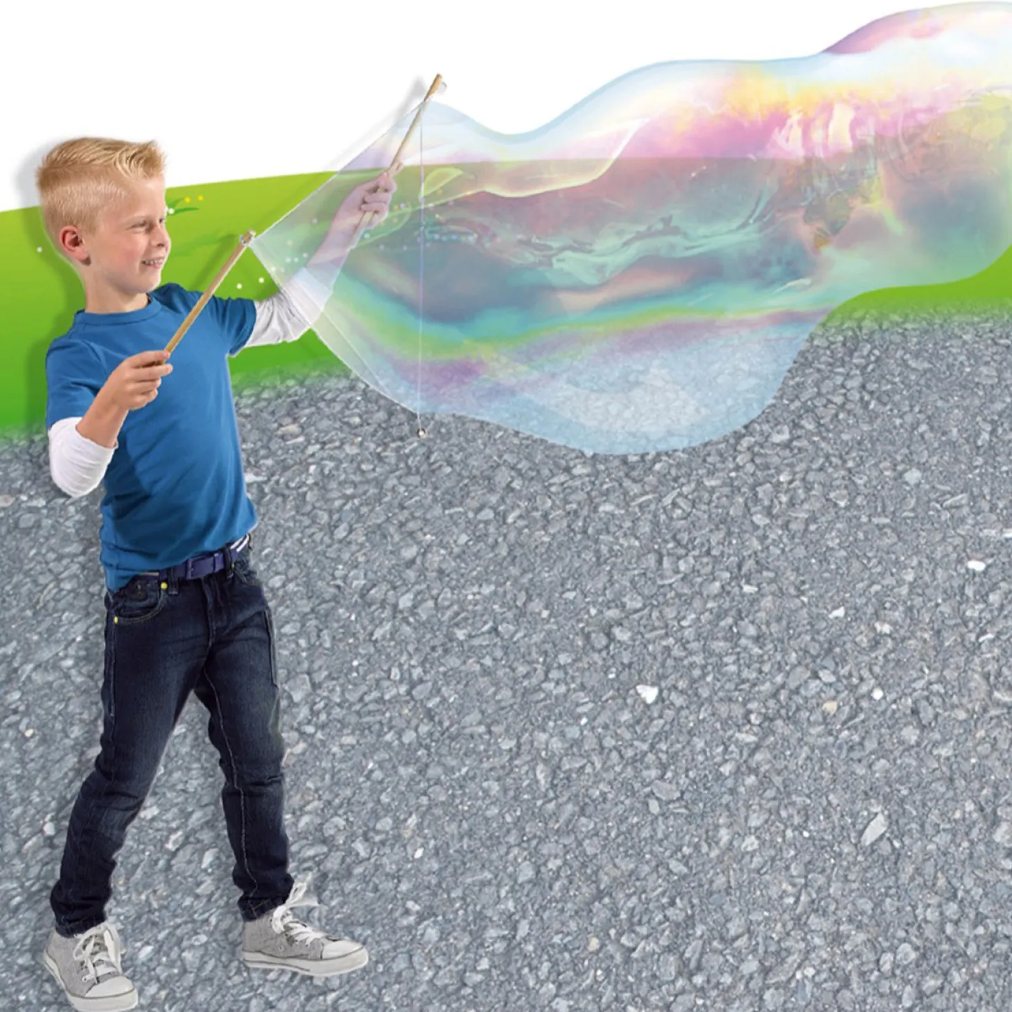 Als je de bel groot genoeg vindt doe je de stokjes weer bij elkaar en laat je de mega bel door de lucht vliegen. Door zachtjes tegen de rand van de grote bel te blazen ontstaat er een klein belletje in de mega bel.