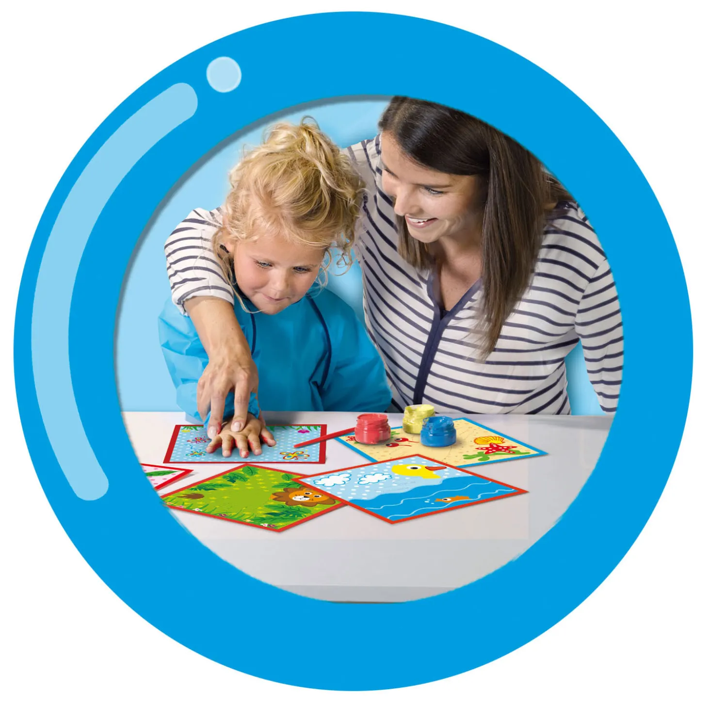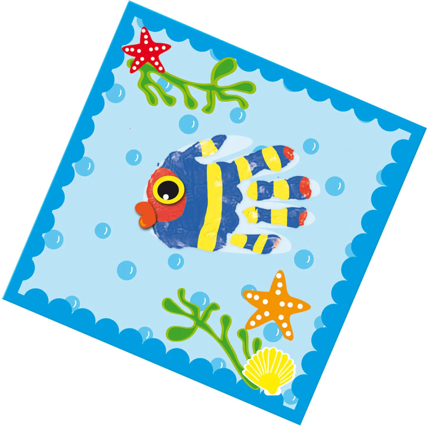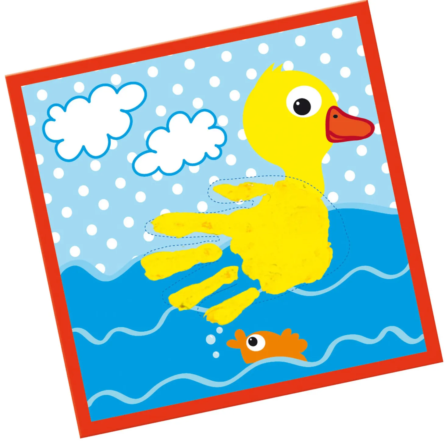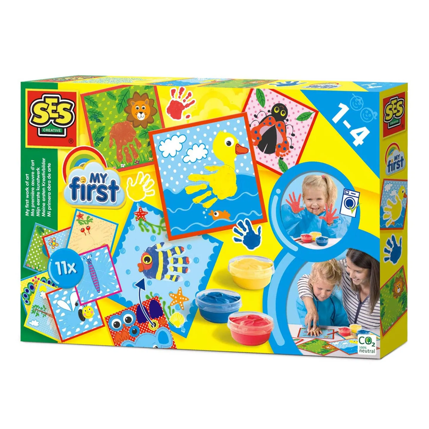Artikelnr. SES 14419. SES Mijn eerste kunstwerk is de perfecte manier voor ouders om hun kindje kennis te laten maken met verf. De set bevat vrolijke voorbedrukte kaarten, waarop staat aangegeven waar je je hand (of voet) kunt plaatsen. Smeer het handje in met verf en plaats het op de kaart. Met de drukwerk details maak je het helemaal af. Het resultaat is altijd goed! Deze set bevat 11 voorbedrukte kaarten, stickervel, kwastje, 3 potjes vingerverf en instructies. De vingerverf van SES is goede en veilige vingerverf, geproduceerd in Nederland. Goed uitwasbaar uit de meeste textielsoorten.