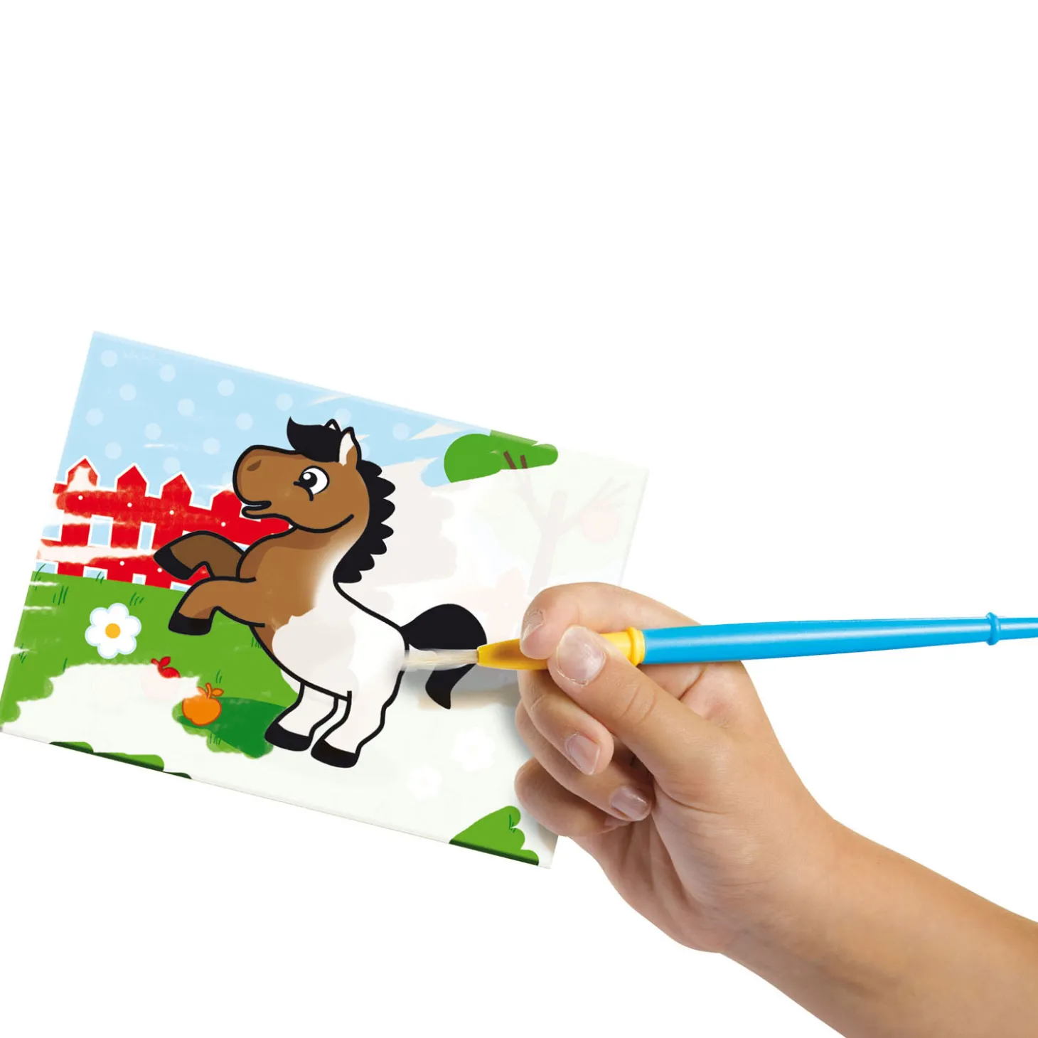 Artikelnr. SES 14421. Magie met water en verven zonder geknoei! Dat kan met deze unieke set van SES. Ga met een natte kwast over de voorbedrukte kaarten en zie hoe de kleurplaat zichtbaar wordt. De kwast is veilig te gebruiken, omdat de haren niet kunnen uitvallen. Na opdrogen steeds opnieuw te gebruiken. Inhoud: veilige kwast en 4 voorbedrukte kaarten.