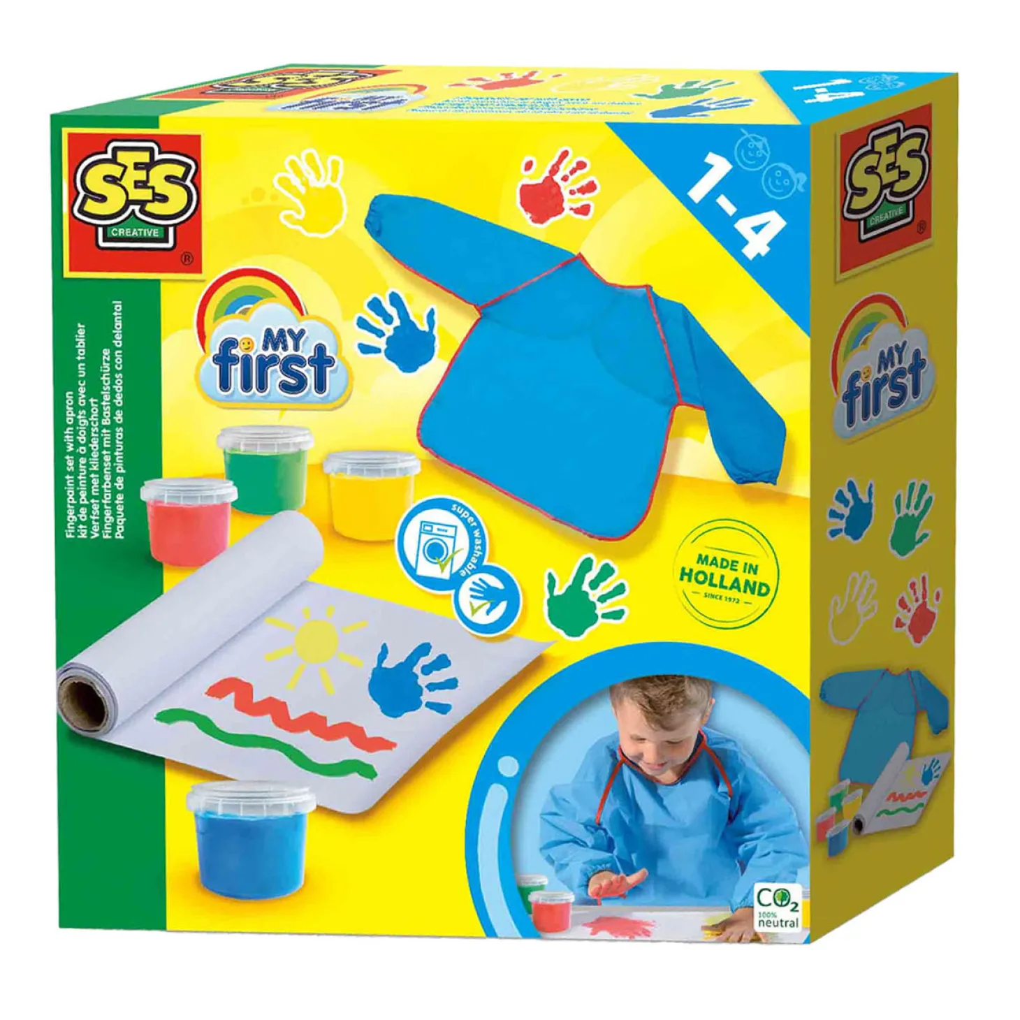 Maak kennis met vingerverf, met deze complete knutselset in de My first collectie van SES Creative. De set bevat alles om kinderen kennis te laten maken met knutselen en aan te sporen tot eigen creativiteit. Trek het kliederschort aan, rol het papier uit en het vingerverven maar! De vier kleuren vingerverf kunnen naar hartenlust gesmeerd, gemengd en gestempeld worden. Veilig te gebruiken vanaf 1 jaar.