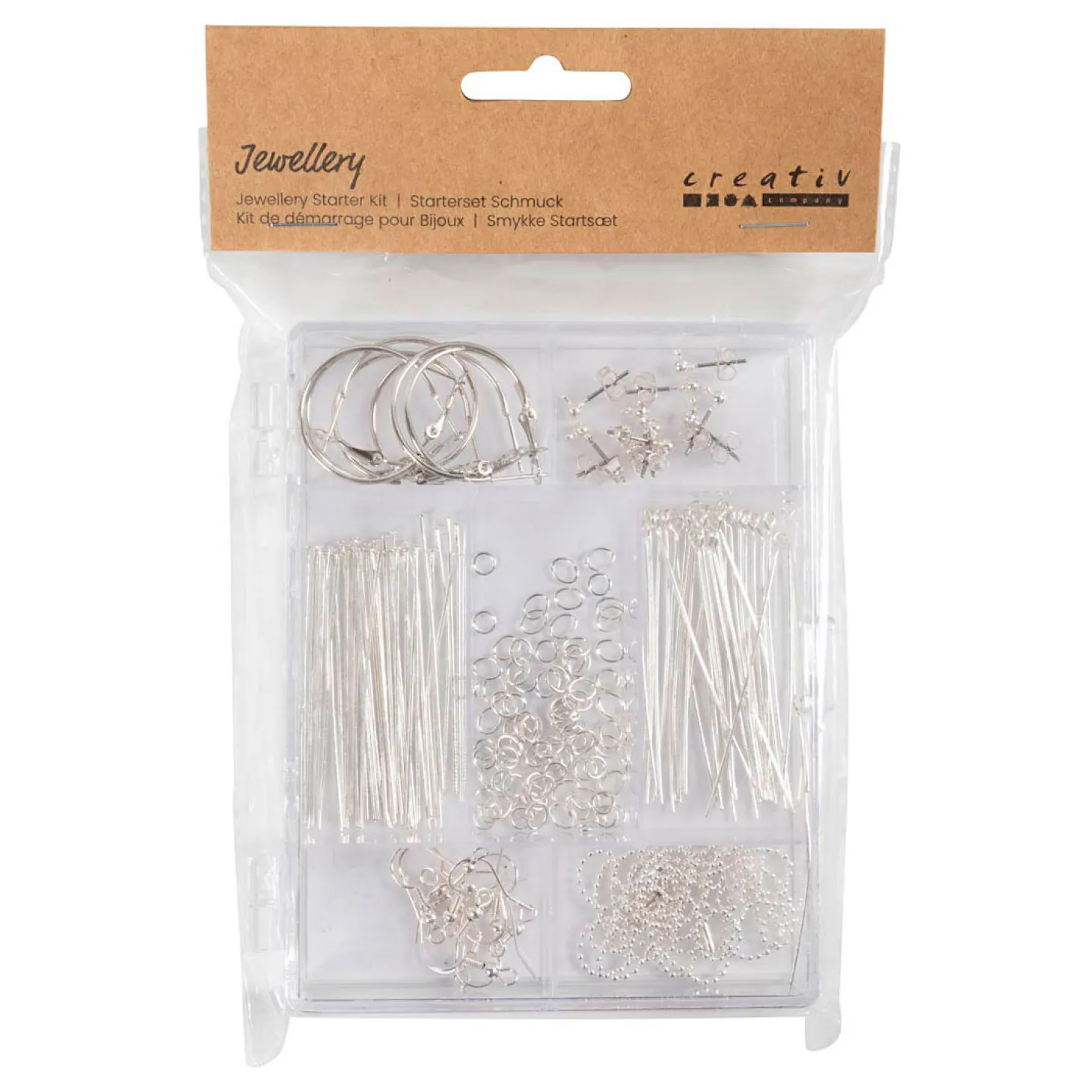Grote set met alle sieraden die je nodig hebt om je eigen unieke sieraden te creëren.Droom je ervan je eigen sieraden te maken? Dan zijn onze startsets voor sieraden precies wat je zoekt. De set bevat de belangrijkste sieraden voor het maken van veel verschillende soorten sieraden. Ze bevat oorringen, Franse oorhaken en de klassieke oorstekers voor het maken van oorsieraden, maar ook nietstiften en jasseron in twee versies. Er is dus voldoende om uit te kiezen in deze sieraden startset..Inhoud: Franse oorbelhaken, oorstekers, oorringen, nietstiften met en zonder oog, O-ringen en jasseron