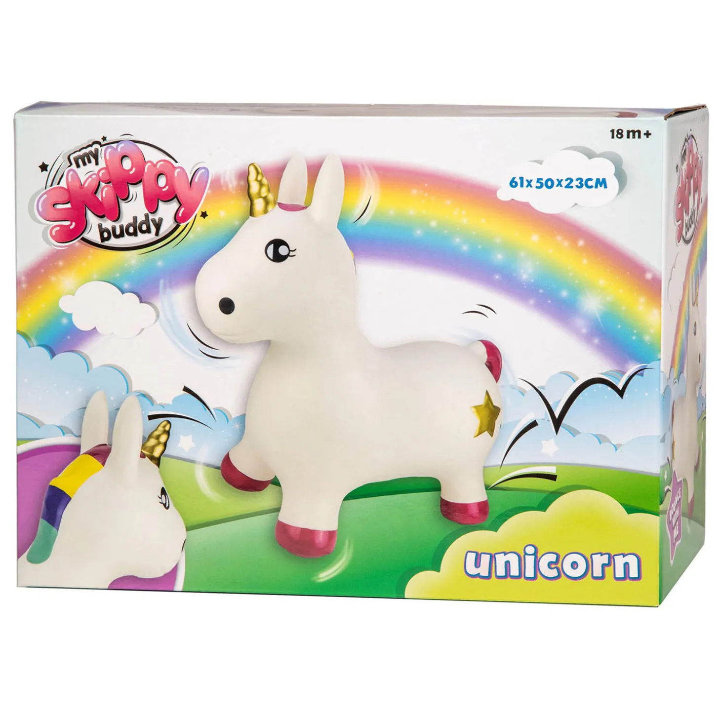Prachtige Skippy Buddy opblaas unicorn. Ontwikkeling van de motoriek aangezien je kindje tegelijkertijd moet springen, vasthouden en balanceren. Op deze manier wordt de hand-oog coördinatie en het balanceren op een leuke manier aangeleerd. Het springen met deze eenhoorn speelgoed werkt hetzelfde als een skippybal en zorgt voor eindeloos springplezier! Afmetingen: 61 x 50 x 23 cm. Maximaal draagvermogen: 50 kg. Wordt geleverd in full-colour doos. Geschikt voor kinderen vanaf 18 maanden.