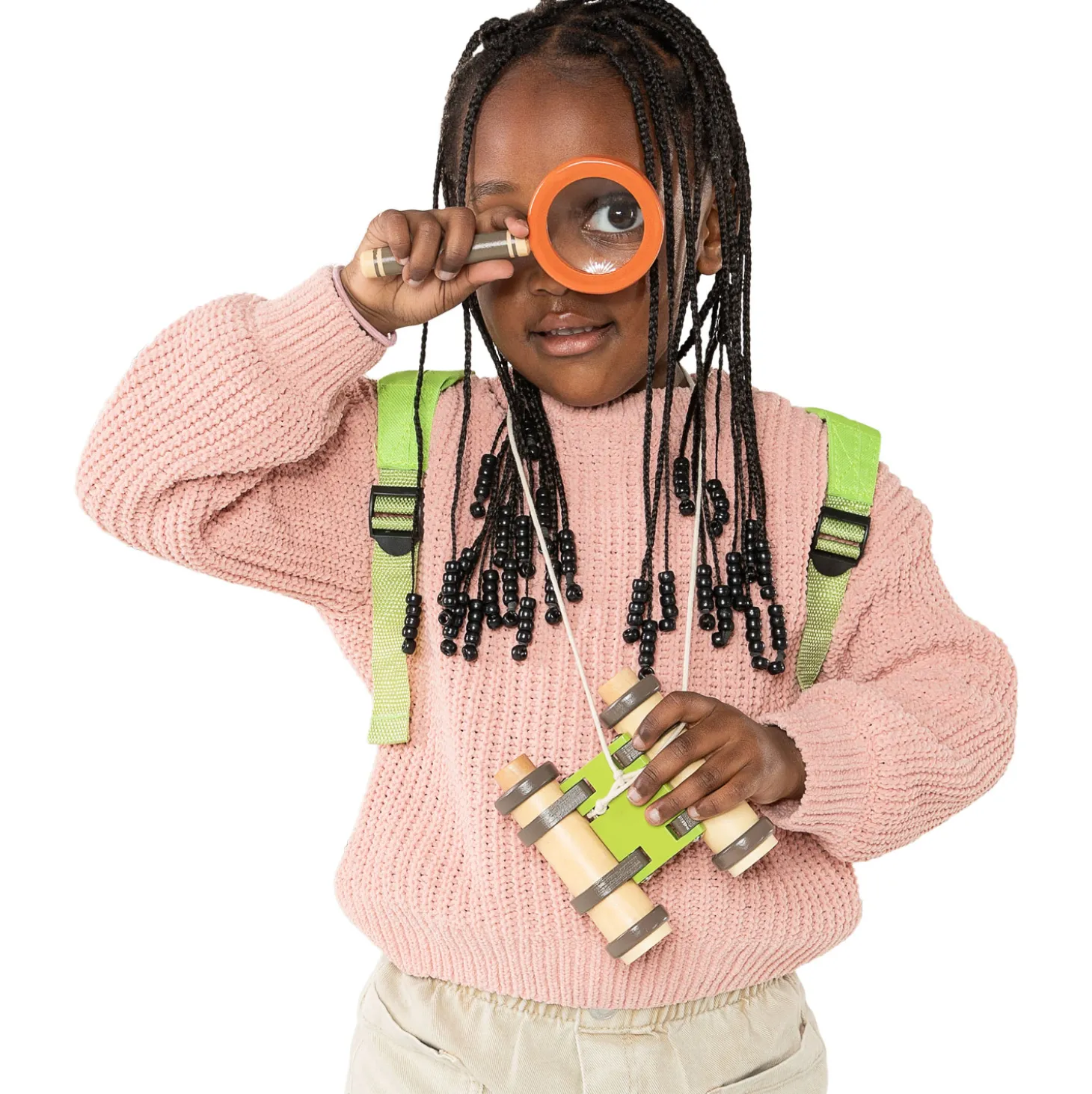 • Incl. insectenpot met schroefdeksel en geïntegreerd vergrootglas, houten verrekijker, insectennet met telescoopstok, kompas met draagkoord, vergrootglas met vergrotingsfunctie, pincet, schep en veerhaak.