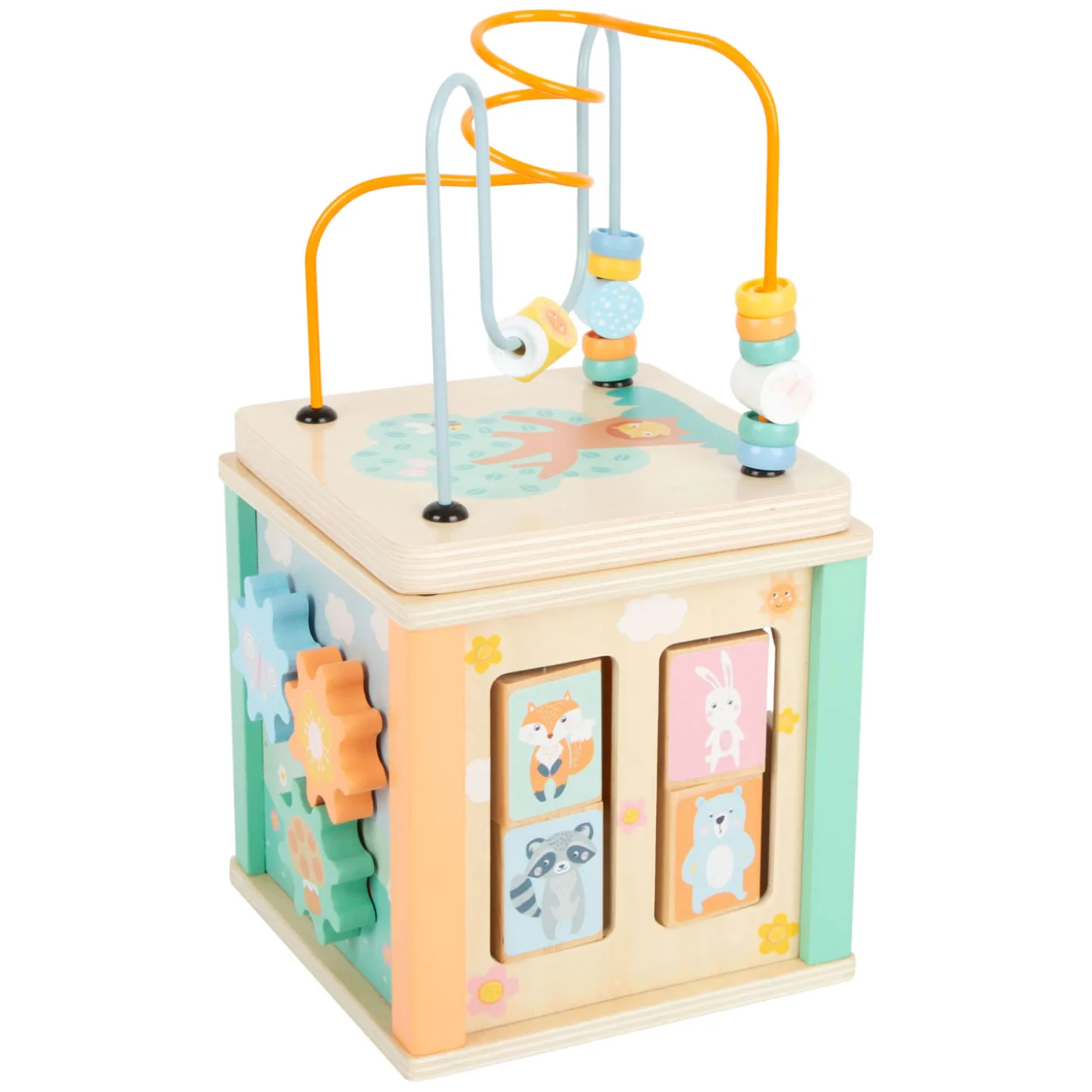 Het hoogtepunt: het deksel is afneembaar en kan ondersteboven in de kubus worden opgeborgen, zodat de motorische kubus na het spelen ruimtebesparend kan worden opgeborgen.