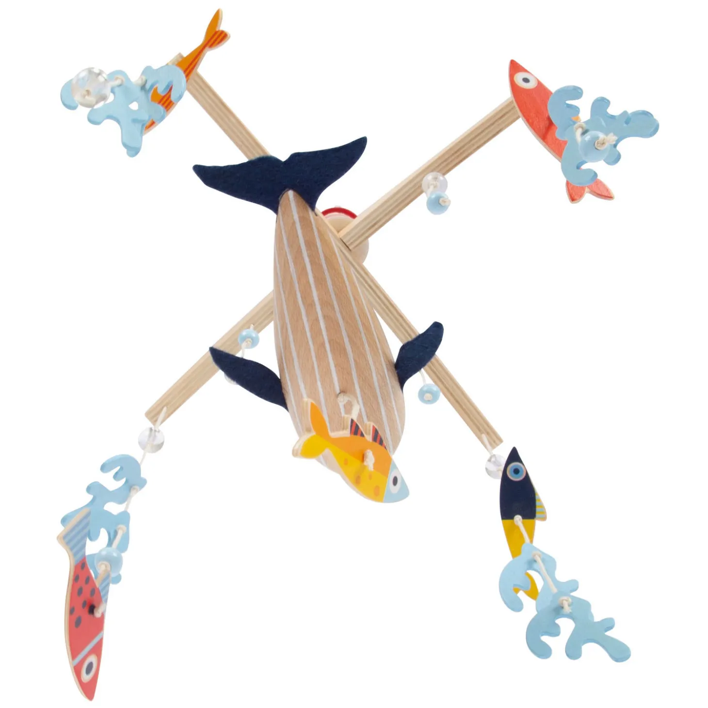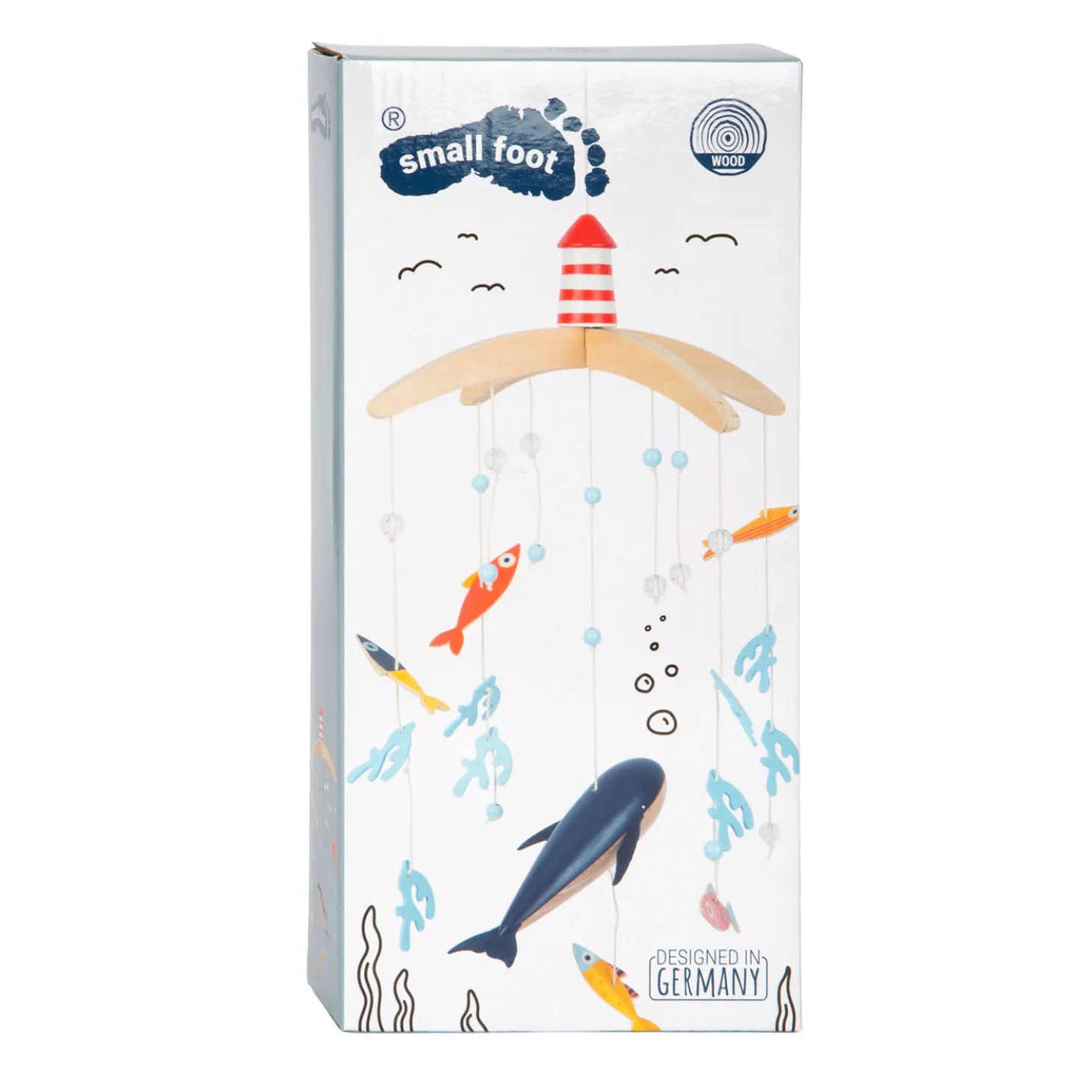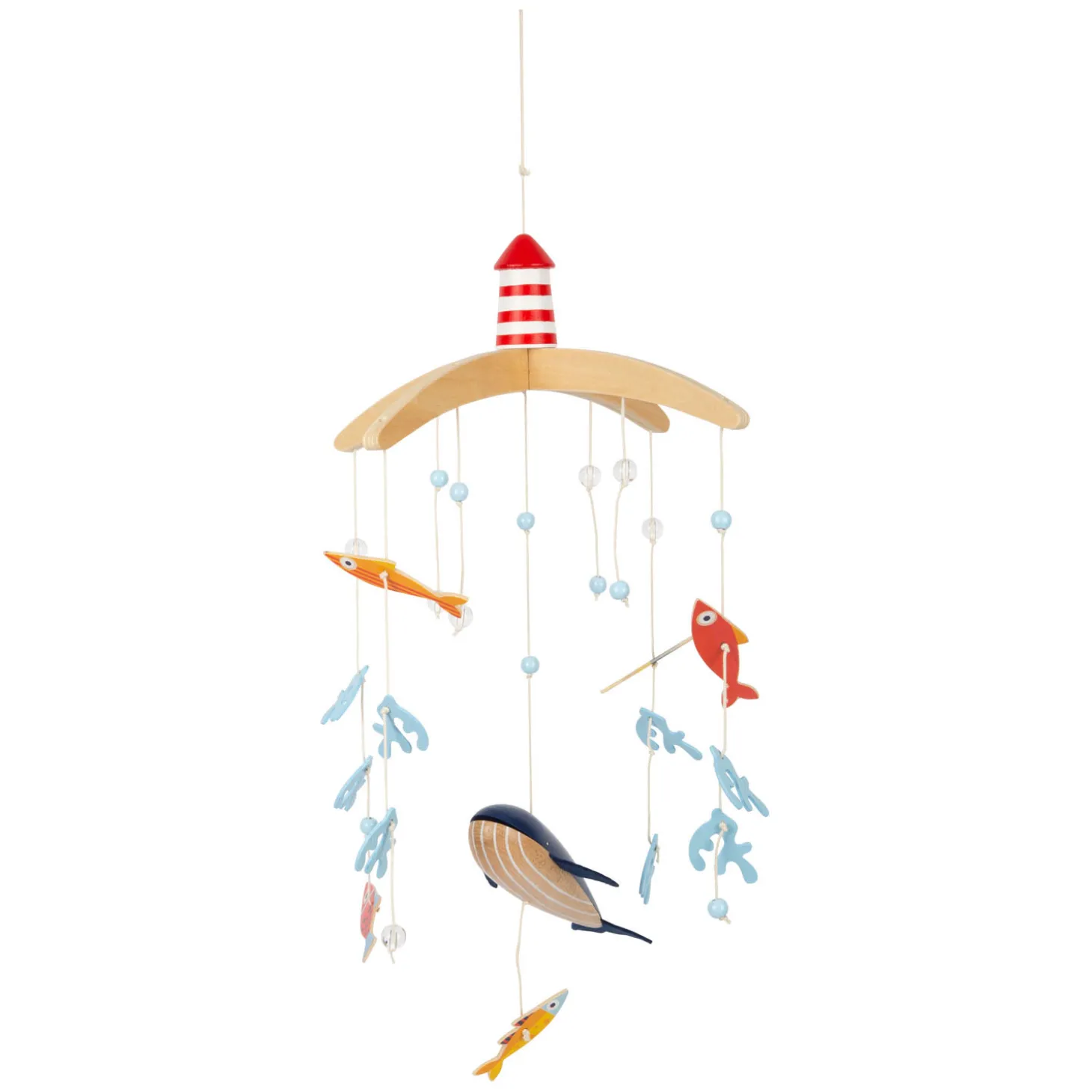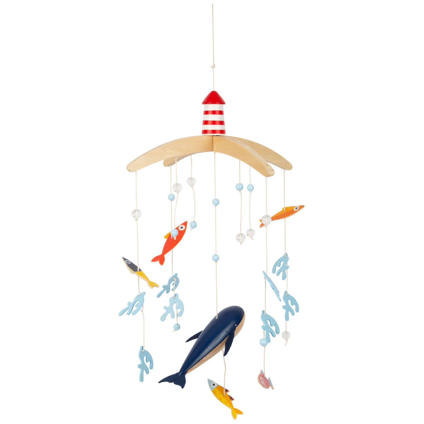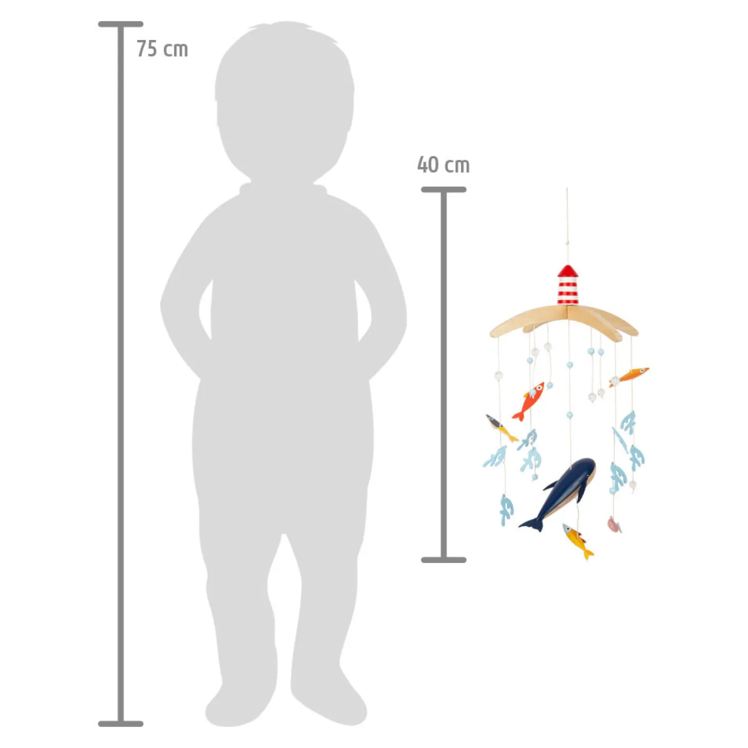 Vanuit het perspectief van kinderen zijn de driedimensionale mobiele elementen en sterk contrasterende kleuren goed zichtbaar. Als deze kinderkameraccessoire ronddraait, is het voor de jonge waarnemers bijzonder interessant om te zien hoe de vissen op een rustige manier in een cirkel zwemmen. Met de grote vuurtoren is deze mobiel een geweldige decoratieve blikvanger in de kinderkamer – en niet alleen voor de jonge, beginnende diepzeeduikers!